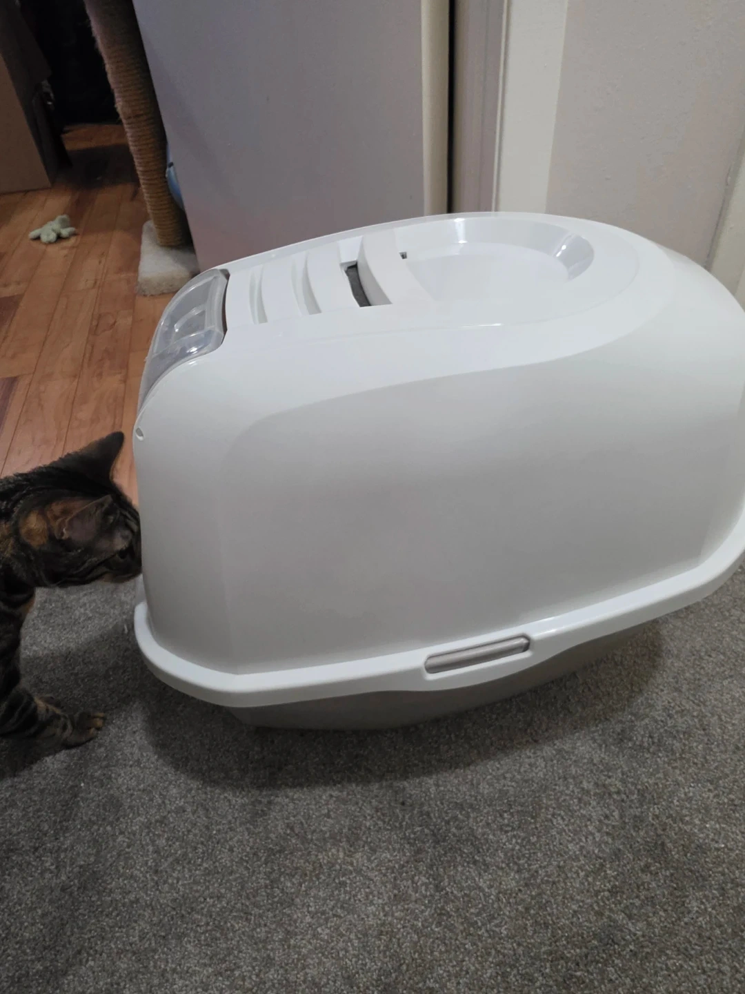 Enclosed hooded litter box in white. Features a clear swinging door and a grated top for ventilation and litter trapping. Helps contain odours and mess. Cat not included