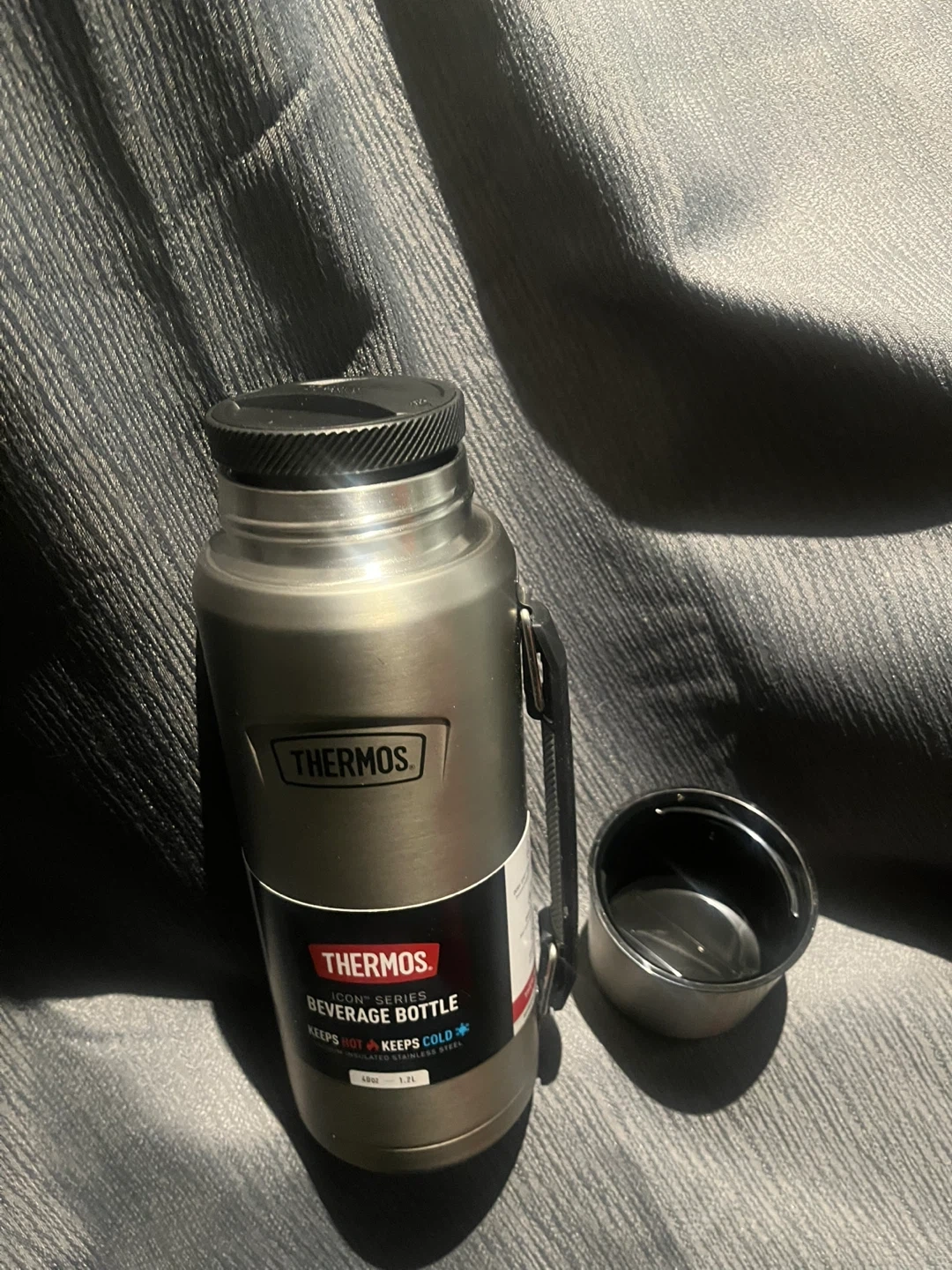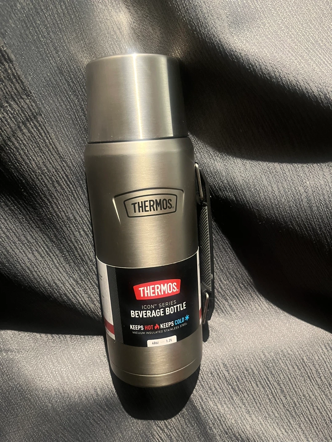 Thermos ICON Series beverage bottle. Keeps hot and keeps cold. Vacuum insulated stainless steel construction. 1.2L capacity.