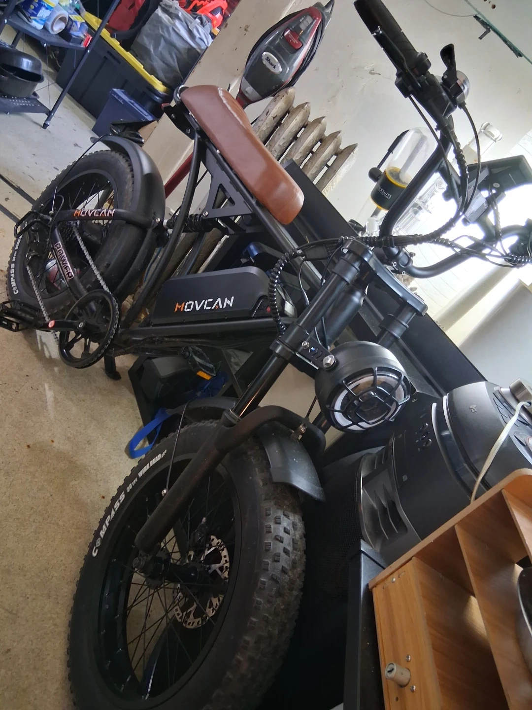 This is a HOVCAN fat tire electric bike. It features a robust frame with a brown seat and thick, knobby tires. The battery pack is integrated into the frame. It has a built-in headlight with a protective grille.