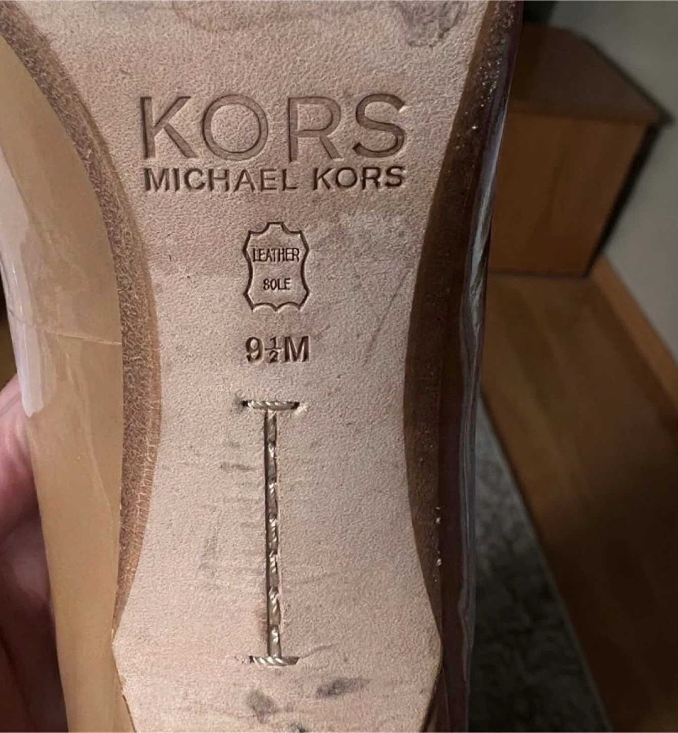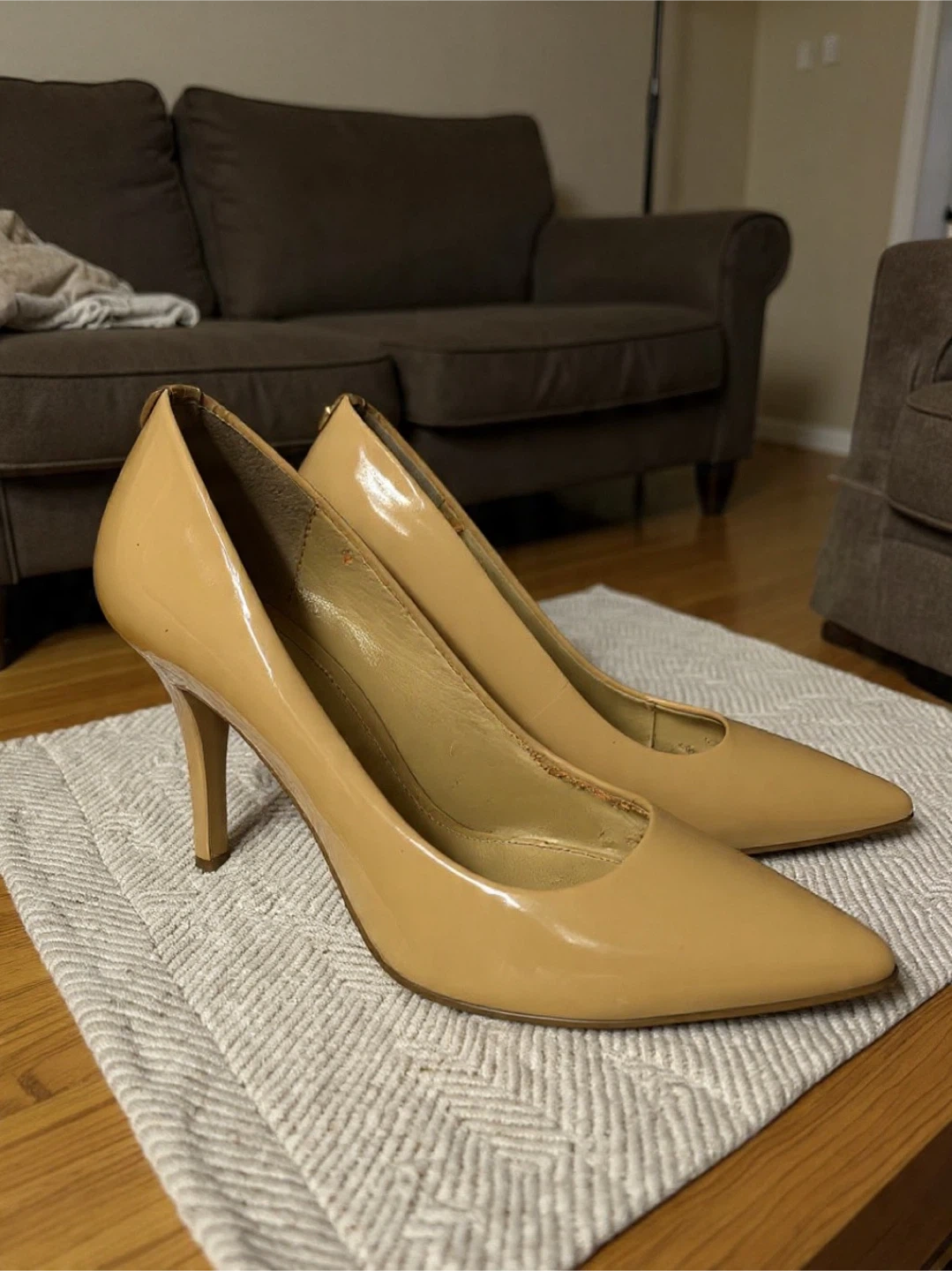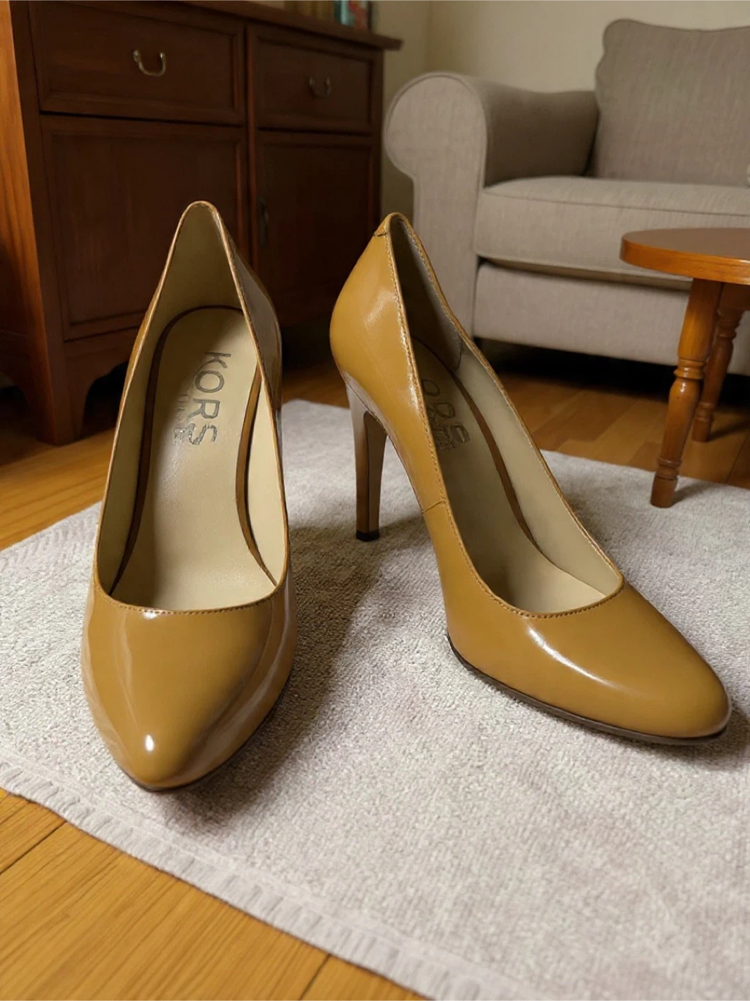 These Michael Kors pumps are a classic tan patent leather. They're a stylish choice for any occasion. Leather upper and lining.