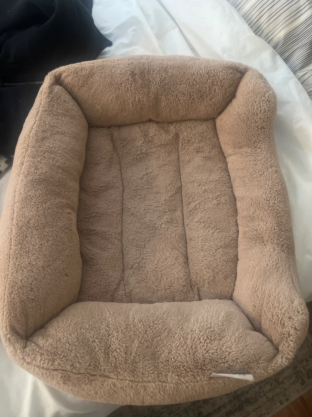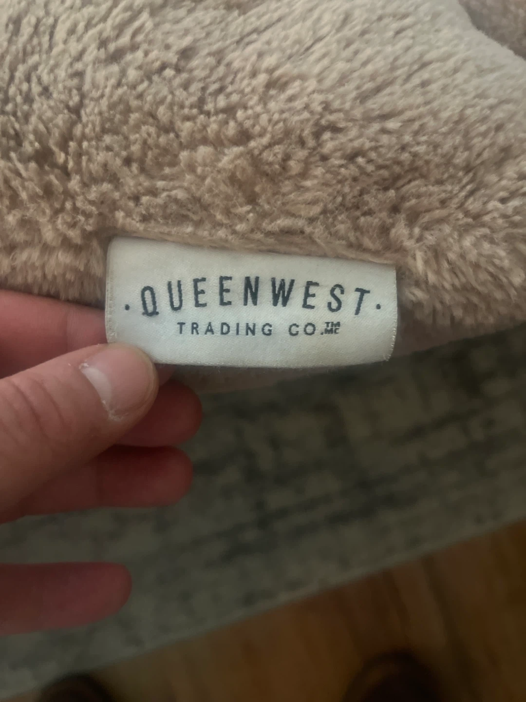 Plush dog bed from Queenwest Trading Co. Made with 100% polyester fill and lining. It's a comfortable spot for your furry friend!