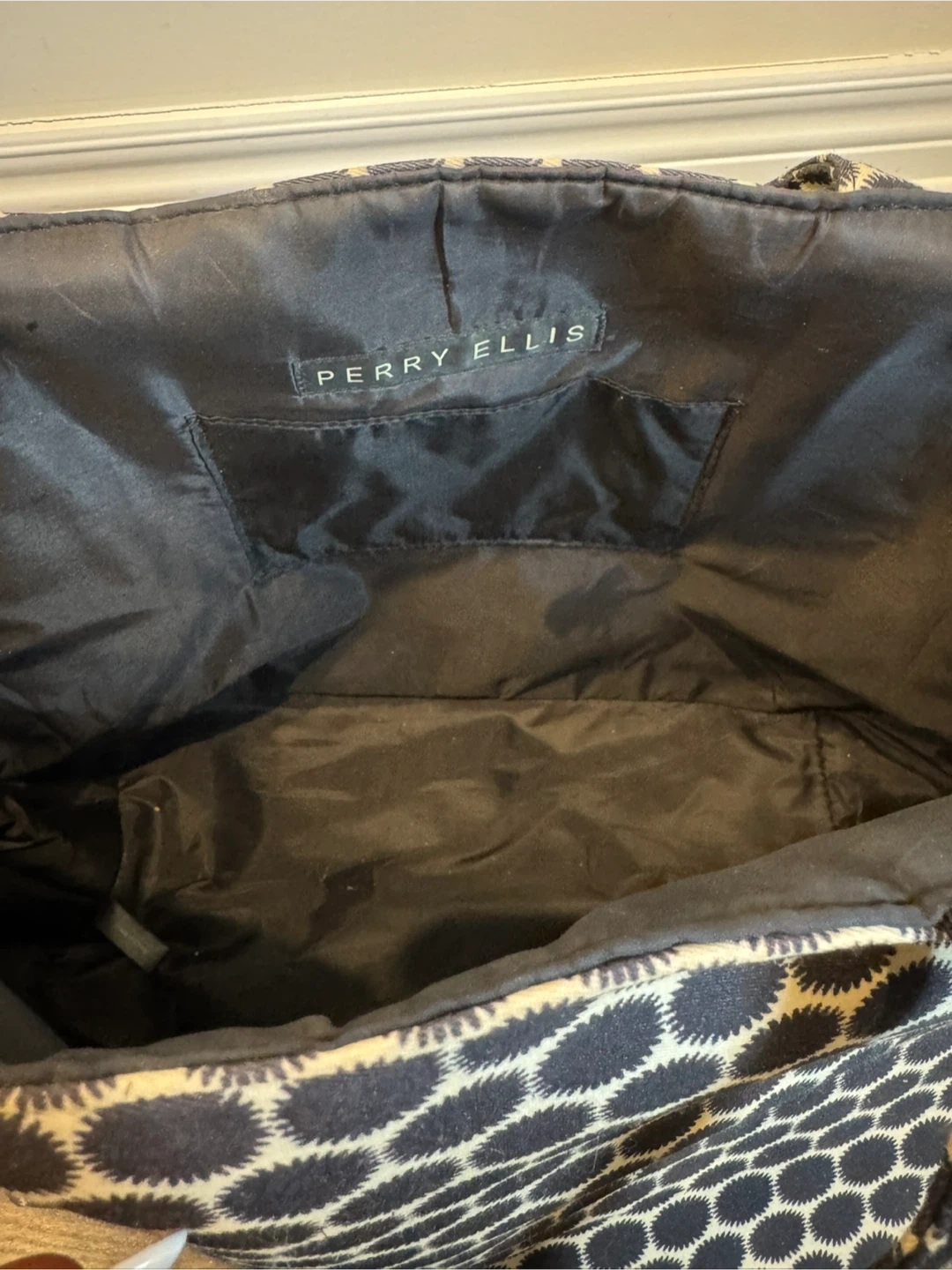 This Perry Ellis tote bag features a black and white geometric pattern. It has an interior pocket for organization. Fabric construction.