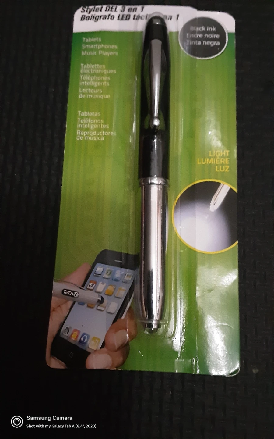 This 3-in-1 stylus pen features black ink and a built-in LED light. It's great for use with tablets, smartphones, and music players. The pen is designed for smooth writing and precise touchscreen interaction.