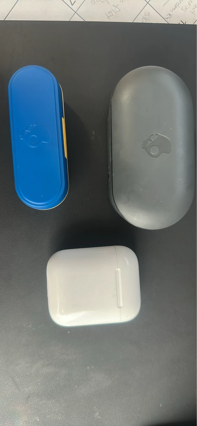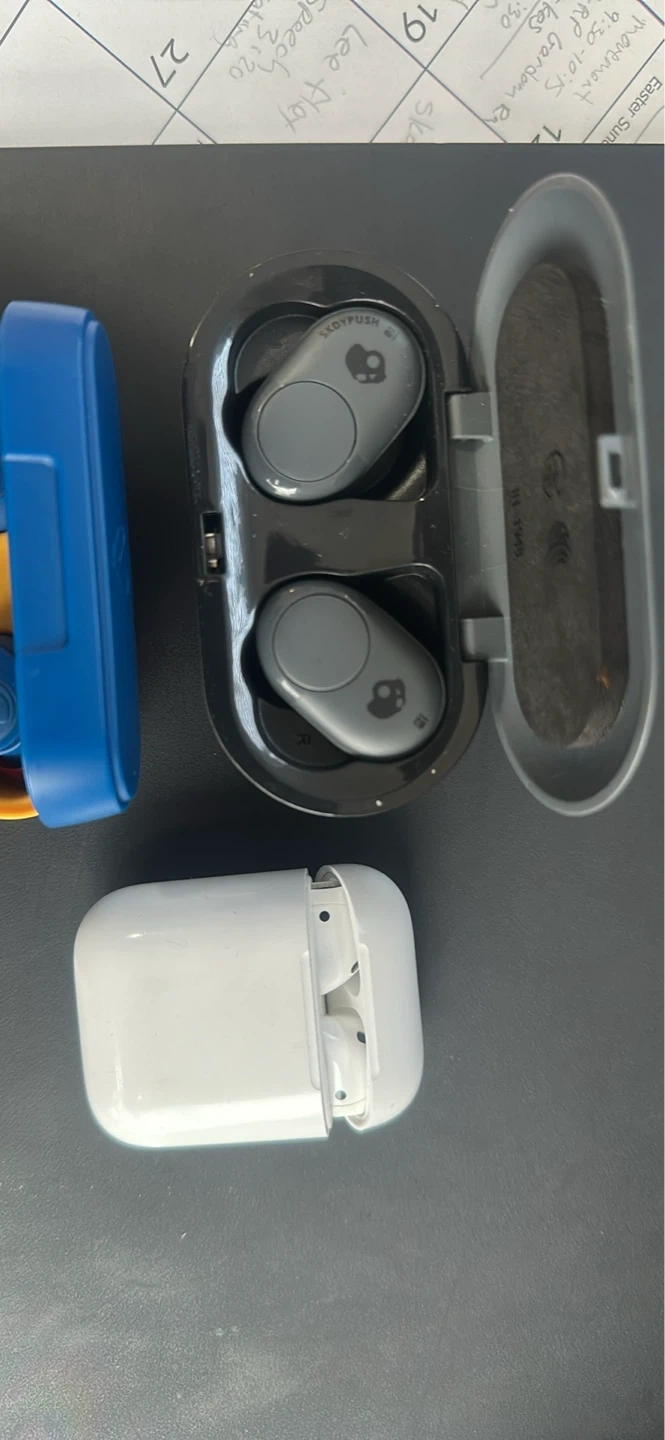 Skullcandy wireless earbuds in grey. They come with their charging case. Also includes a white charging case. Great for listening to music on the go!