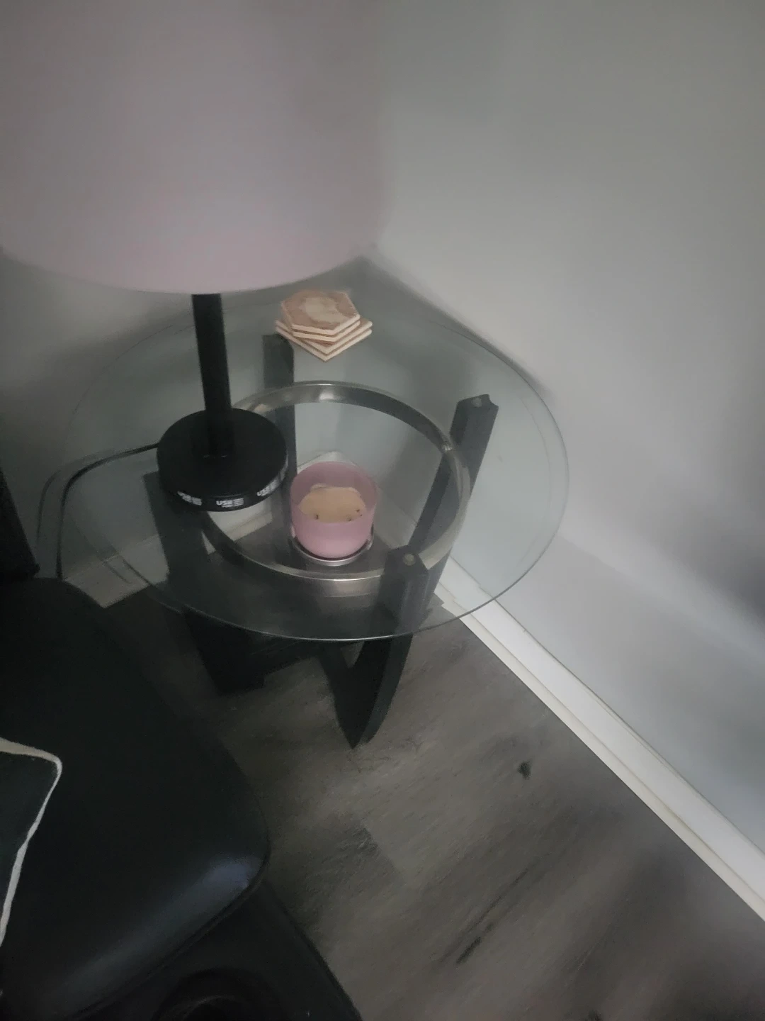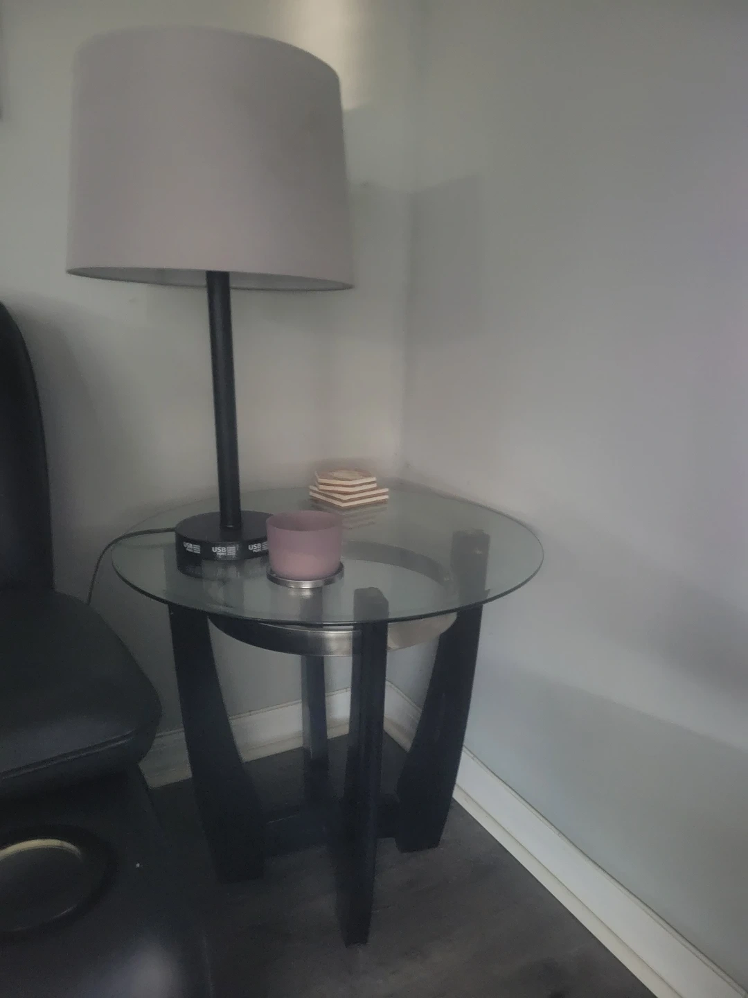 This round side table features a clear glass top with a metal accent ring. It has a dark wood base with an interesting geometric design. It's perfect and includes lamps, books, or drinks next to a sofa or chair.