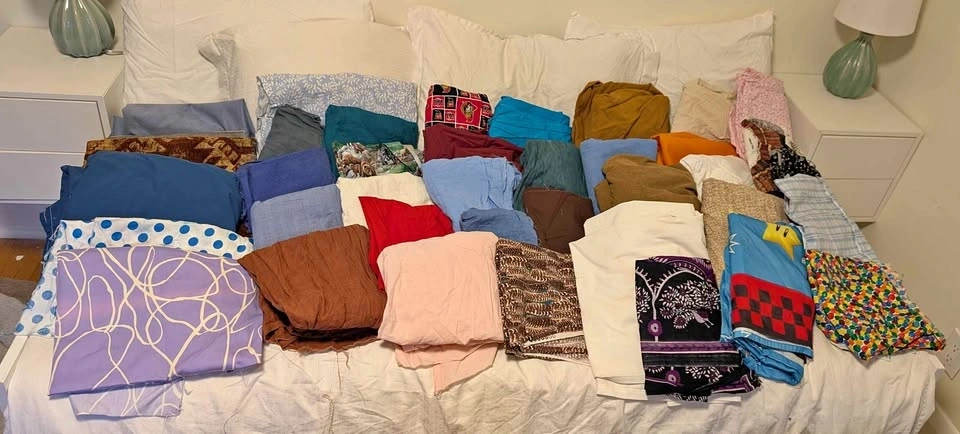 Selling this bundle of fabric pieces. Suitable for larger projects, many even for clothing. Variety of types, colours, and patterns that have already been washed on cold and hung to dry. Please take a look at my other listings for more fabric offerings!