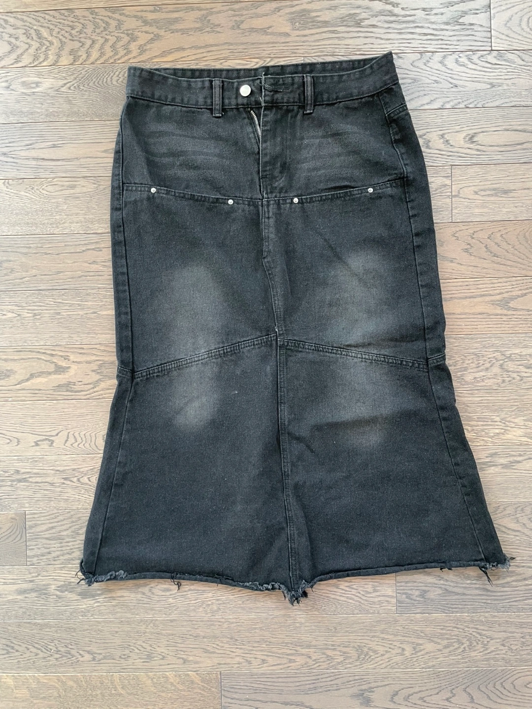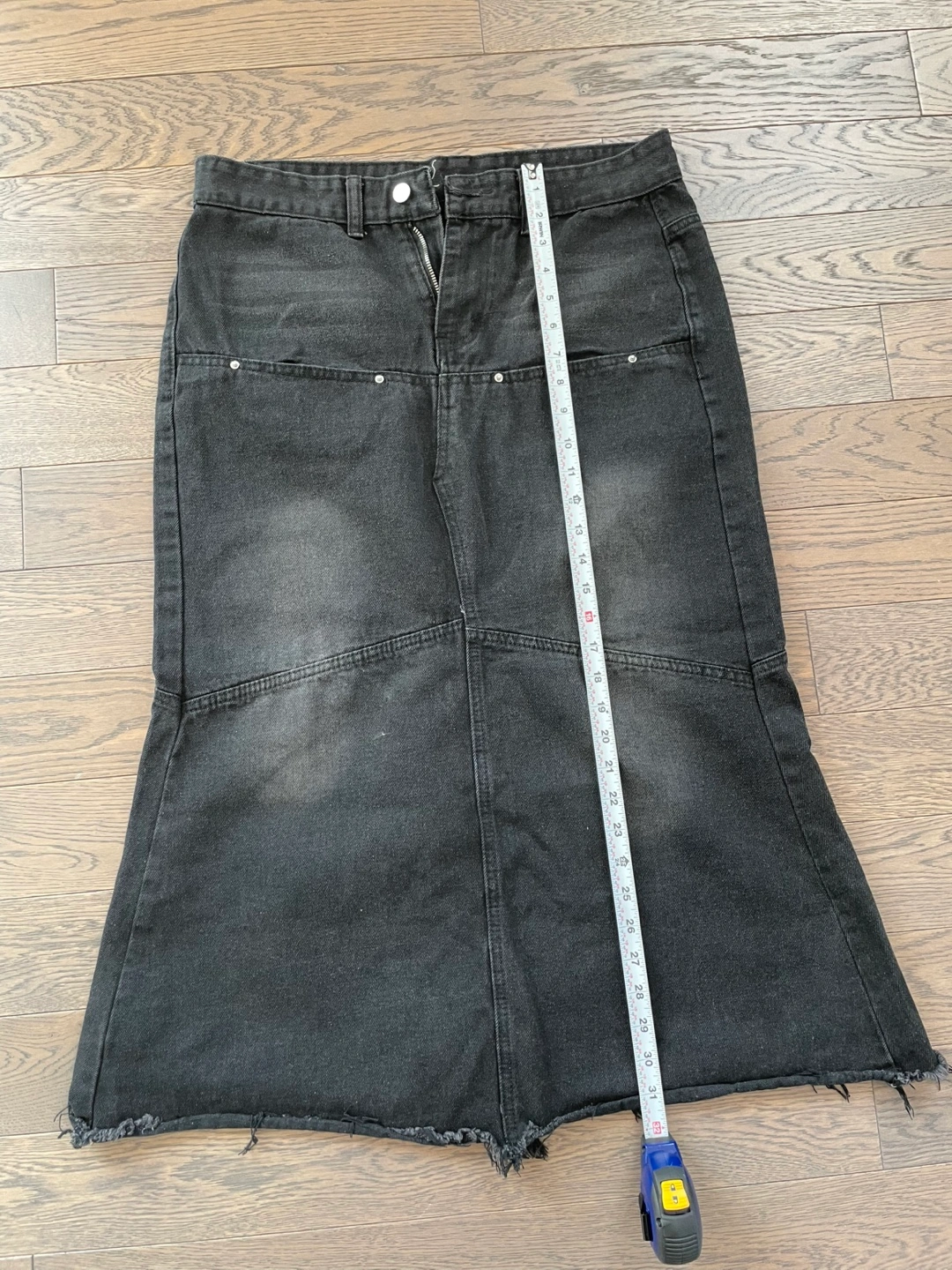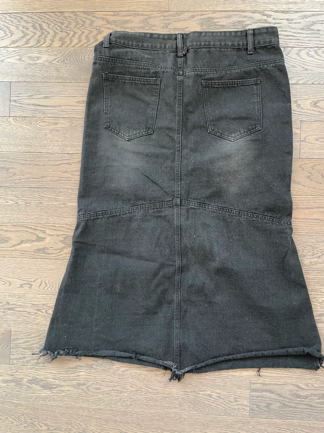 This black denim maxi skirt features a stylish patchwork design and a raw hem. It's a size XXL. The skirt has a zipper and button closure.