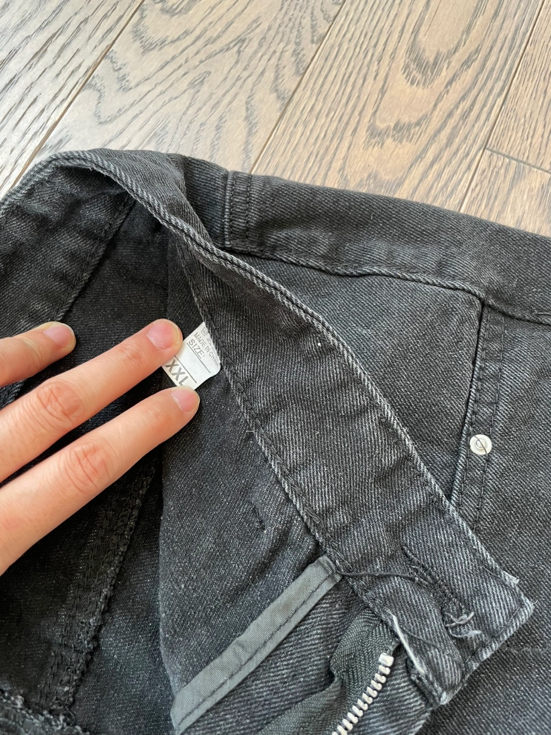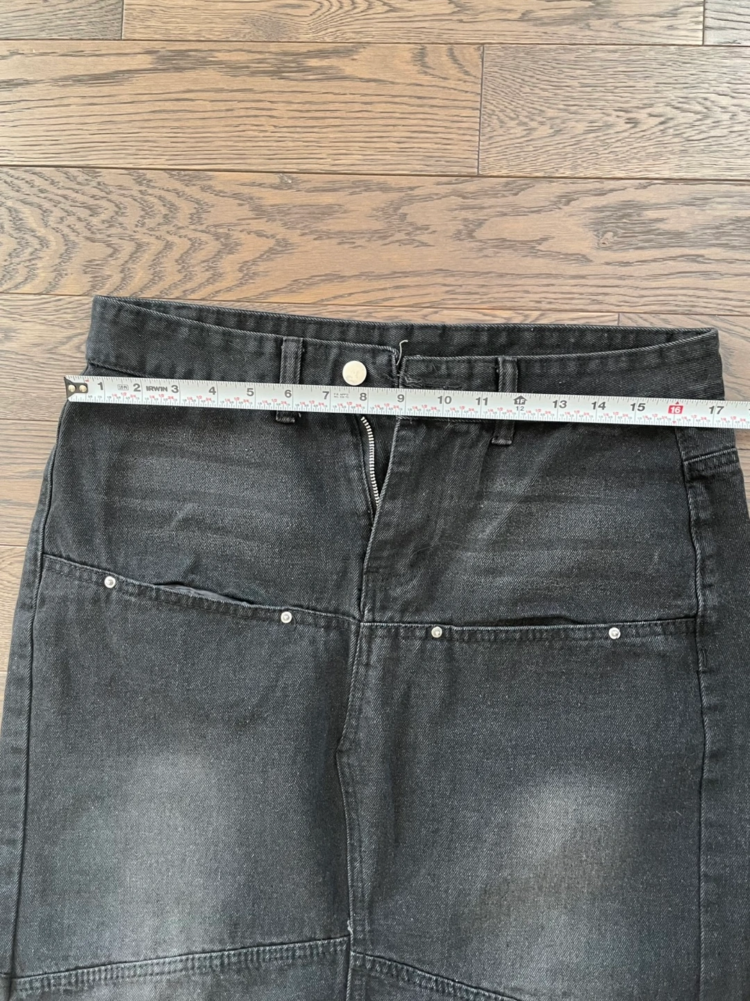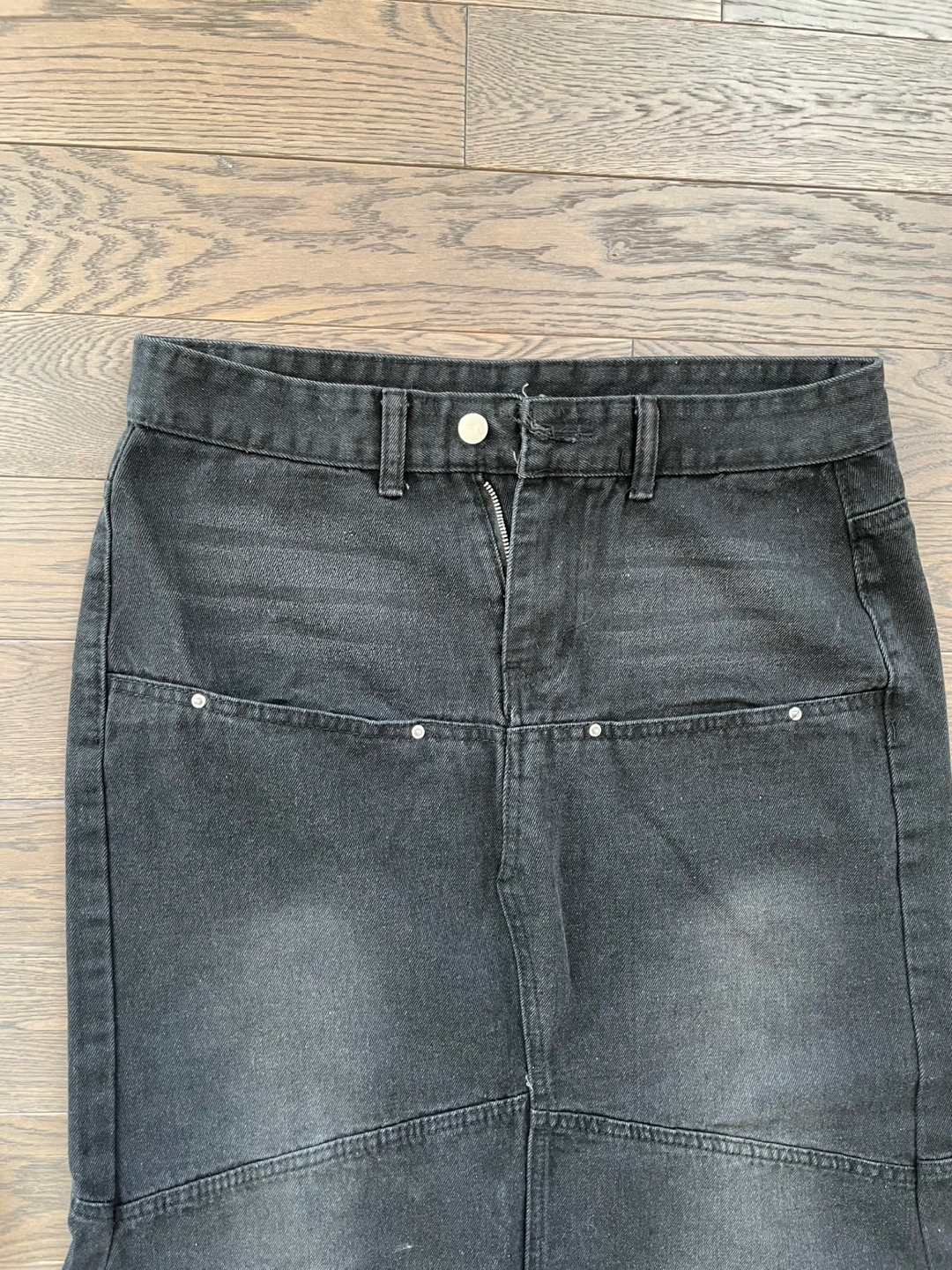 This black denim maxi skirt features a stylish patchwork design and a raw hem. It's a size XXL. The skirt has a zipper and button closure.