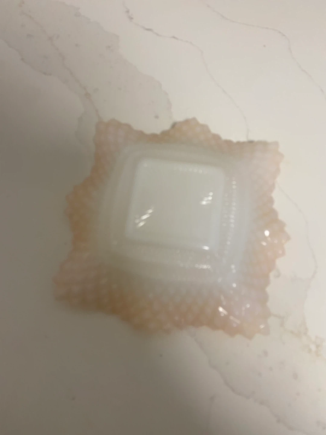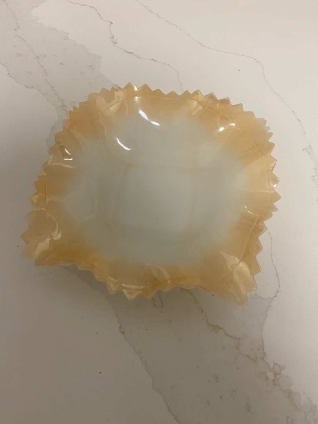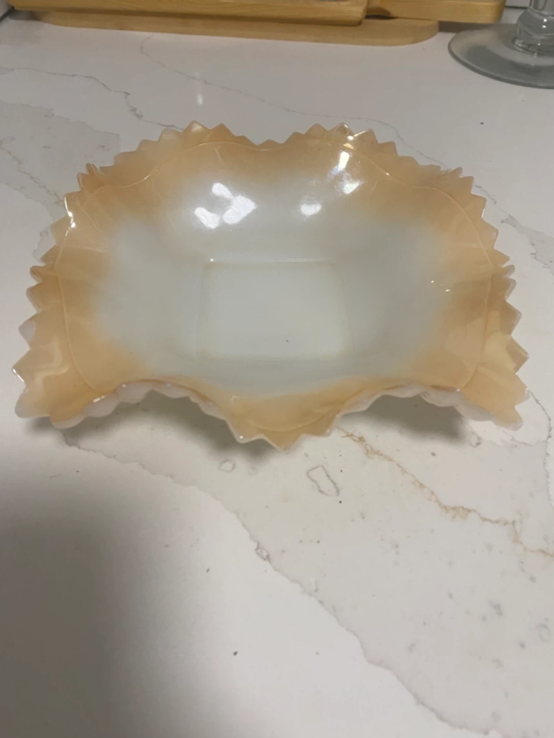 Lovely opalescent glass candy dish with a ruffled edge. It's white with an amber hue on the rim. Glass material. Perfect for serving small treats or as a decorative accent piece!