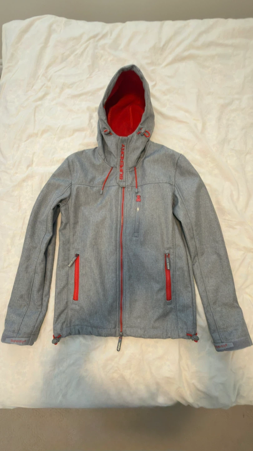 Superdry Original Windtrekker jacket. It's grey with red lining and zippers. Size is small,for unisex good for daily wear cash and pickup only