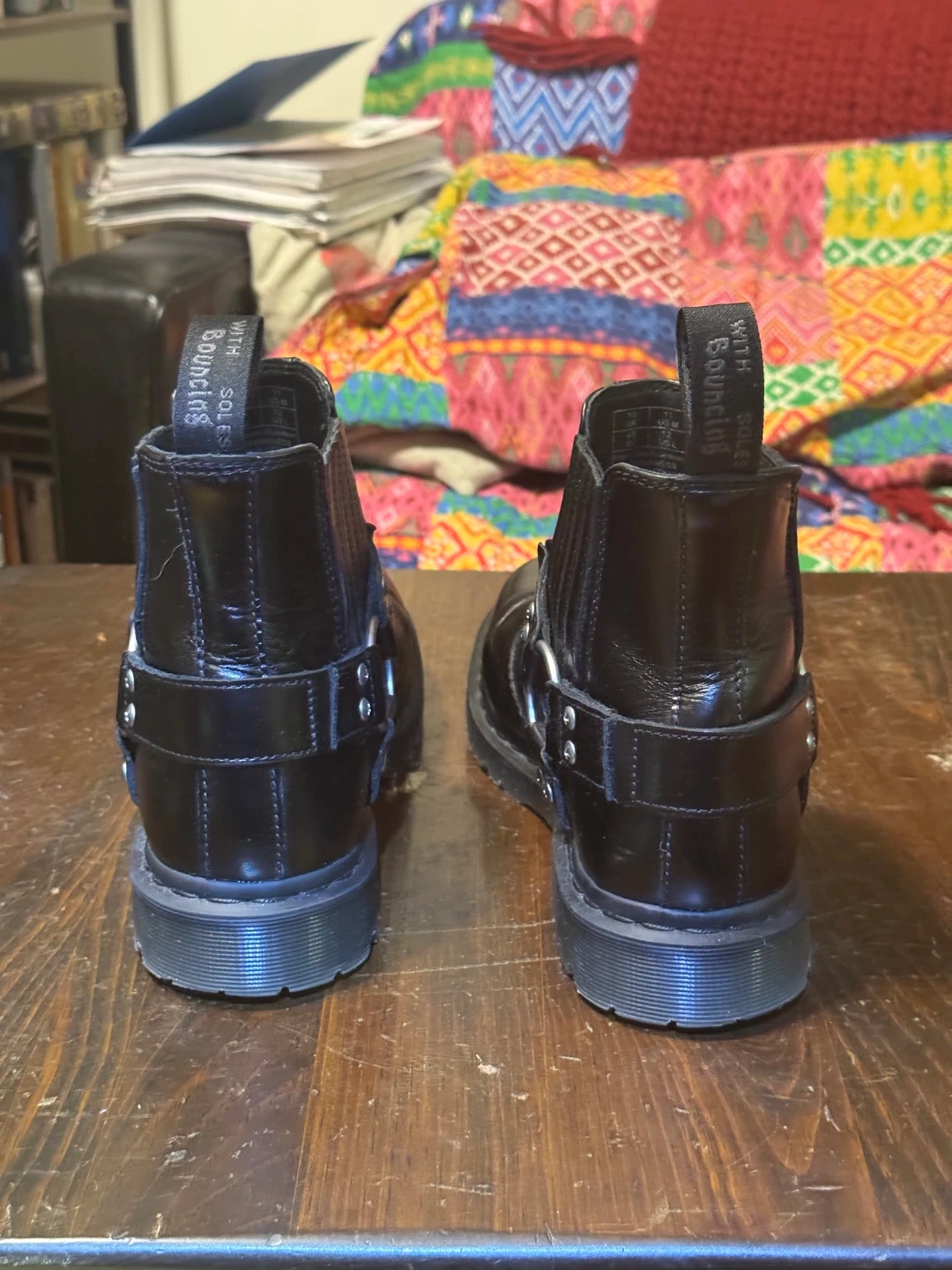 Selling a pair of Dr. Martens black leather Chelsea boots. They feature a stylish strap and buckle design. The boots are in good condition and ready for a new owner. Size US 11M