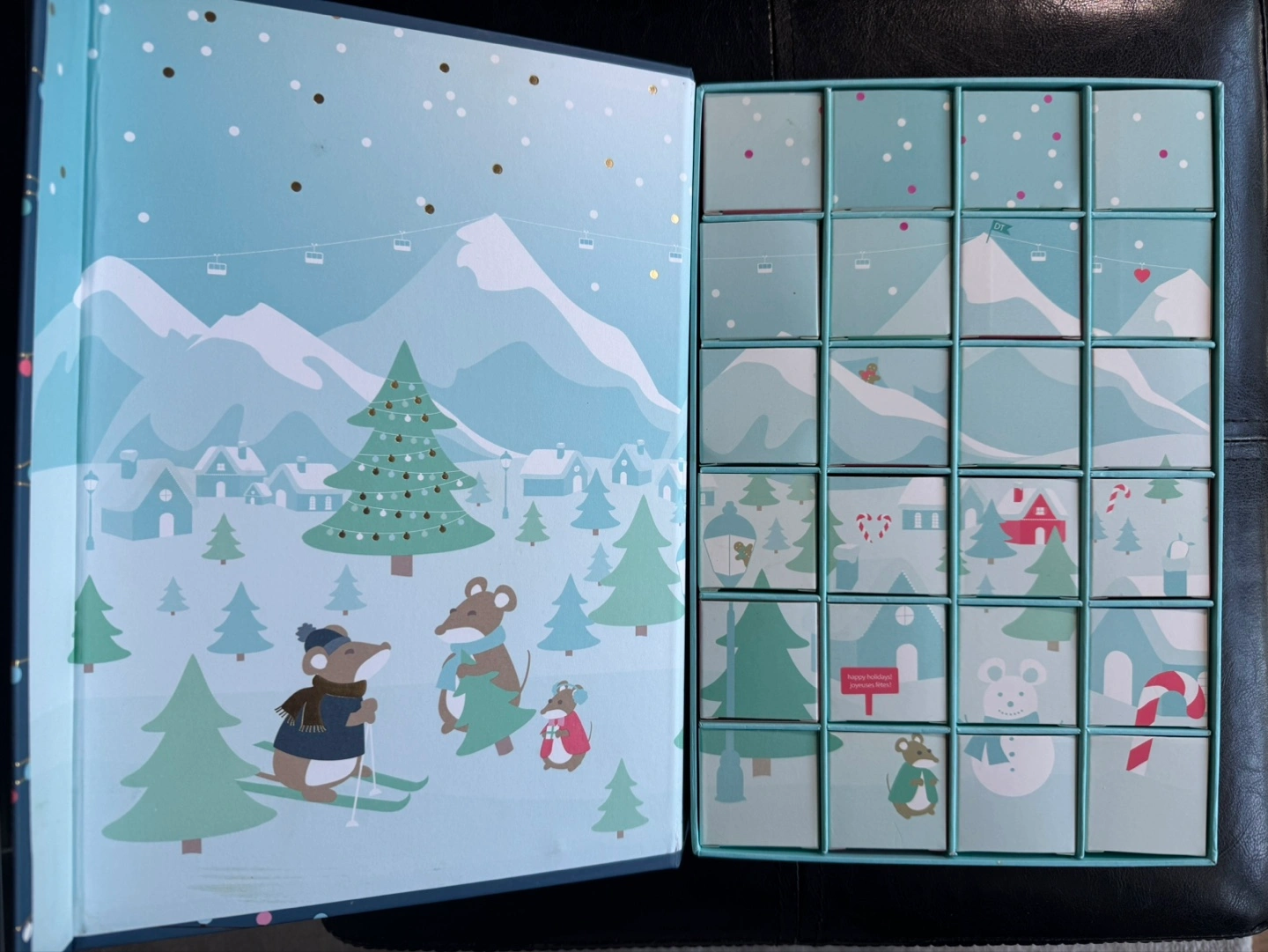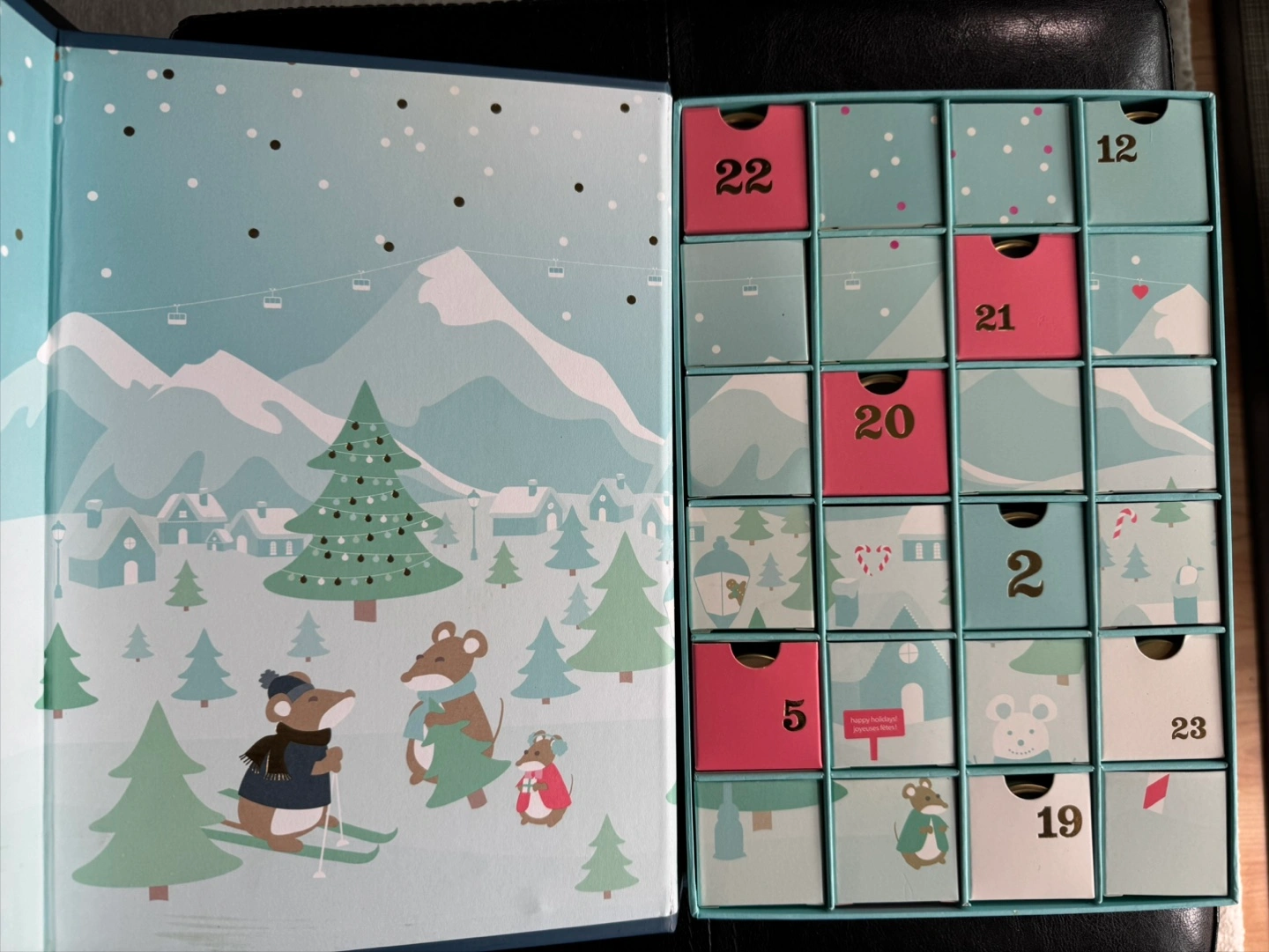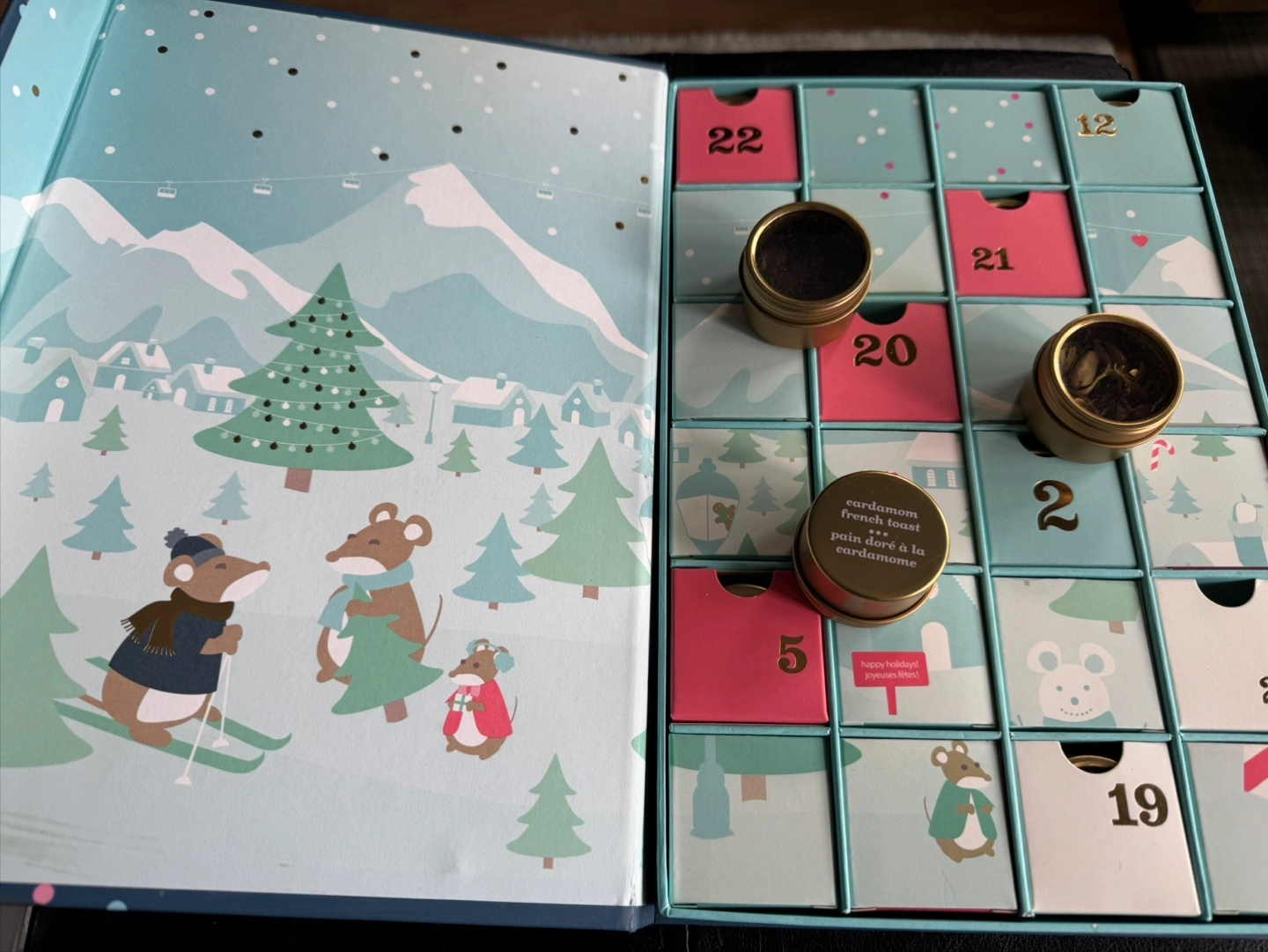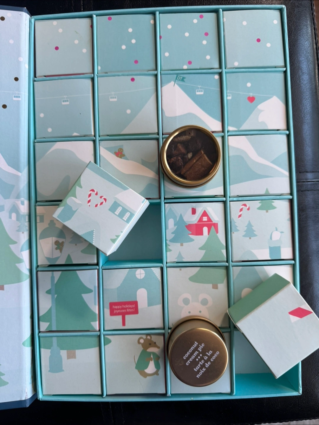 Used DavidsTea advent calendar box. 24 drawers with mini tea canisters. Good condition and can be repurposed to hold small items. Still contains the tea canisters and many of the teas. The drawers reveal a holiday landscape when placed in reverse.