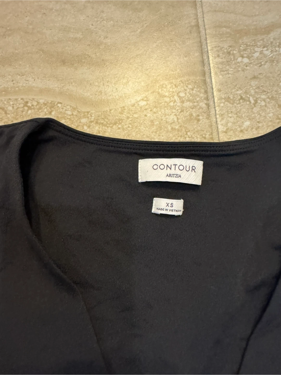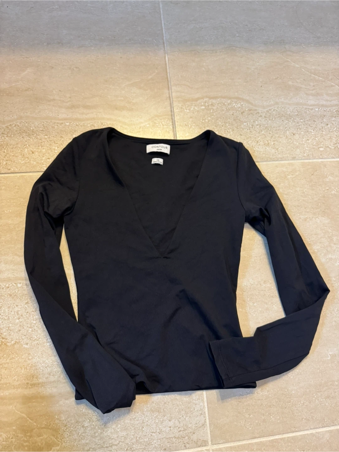 This is a black long-sleeved V-neck top from Aritzia's Contour line. It's made in Vietnam. The fabric is ribbed for a fitted look. XS