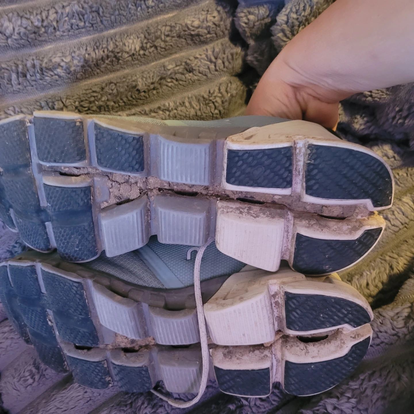 Mens On Cloudflyer WP running shoes in a light blue colour. They're labelled as US M9, EUR 42.5, UK 8.5. The shoes appear to be waterproof. Could use a wash