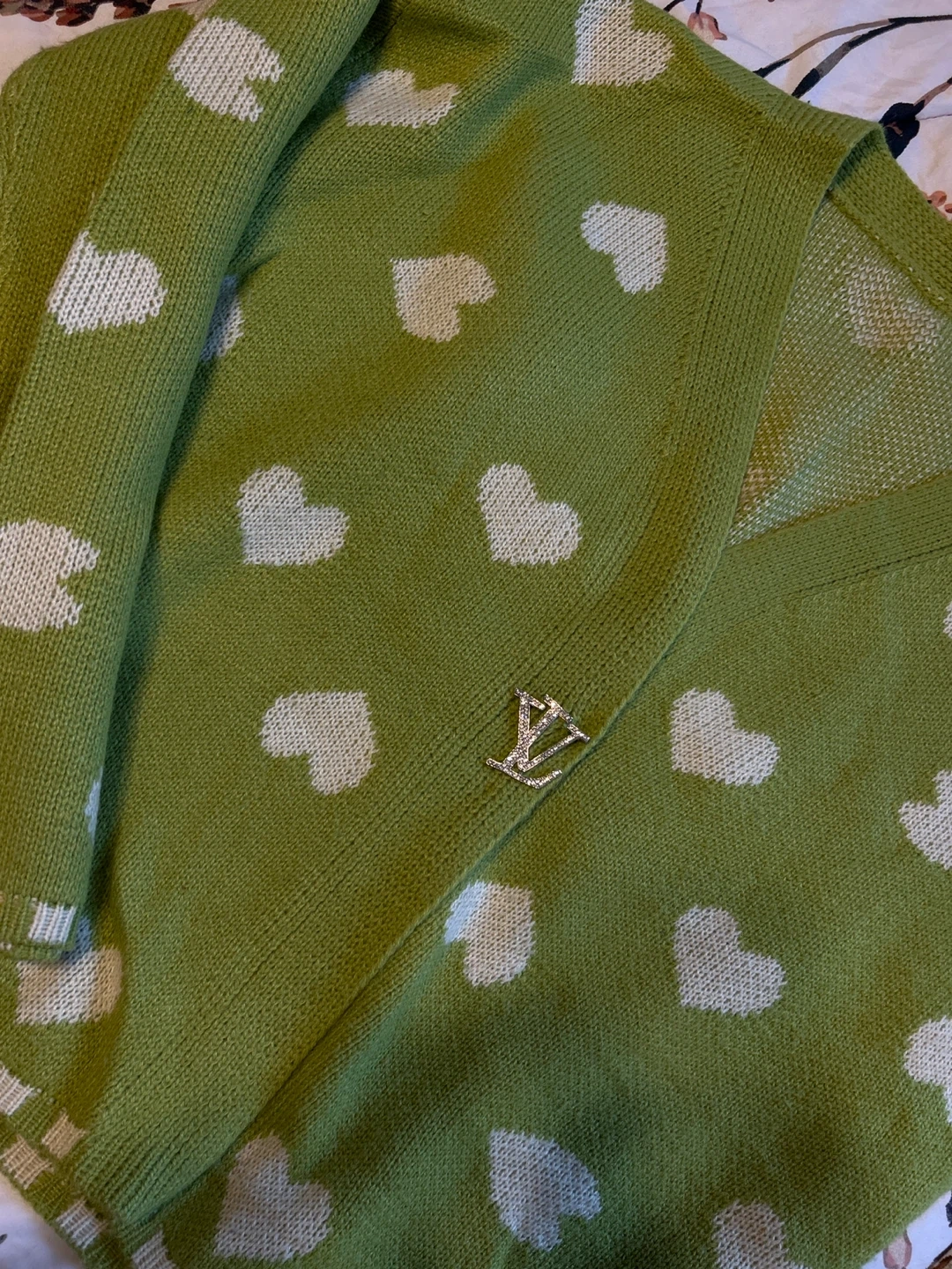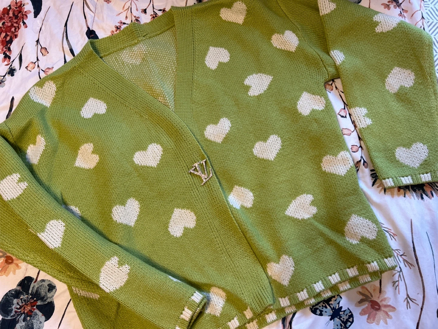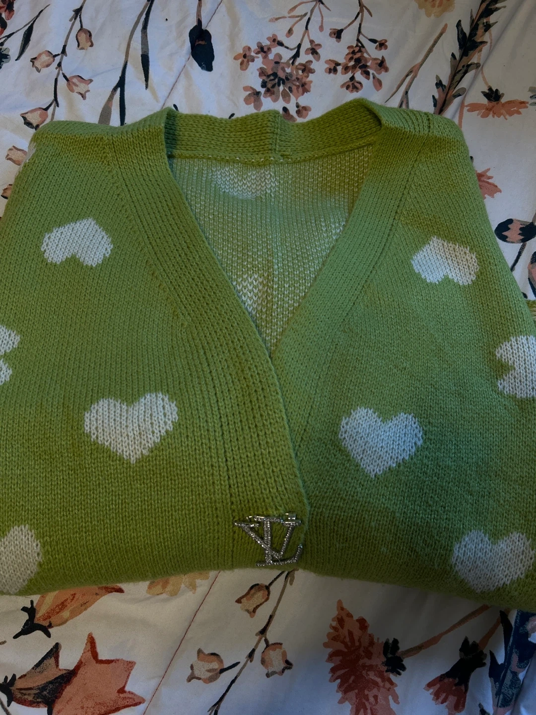 This is a cute green cardigan with a white heart pattern. It's a knitted sweater with a V-neck and button closure. Looks great for a casual outfit!