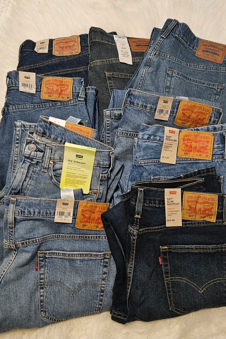 Bundle of various Levi's jeans including 501, 550, 514 styles. Sizes range from 30x32 to 34x34. Mostly denim material with some dark wash and black options. All Brand New! Price is $30 each.