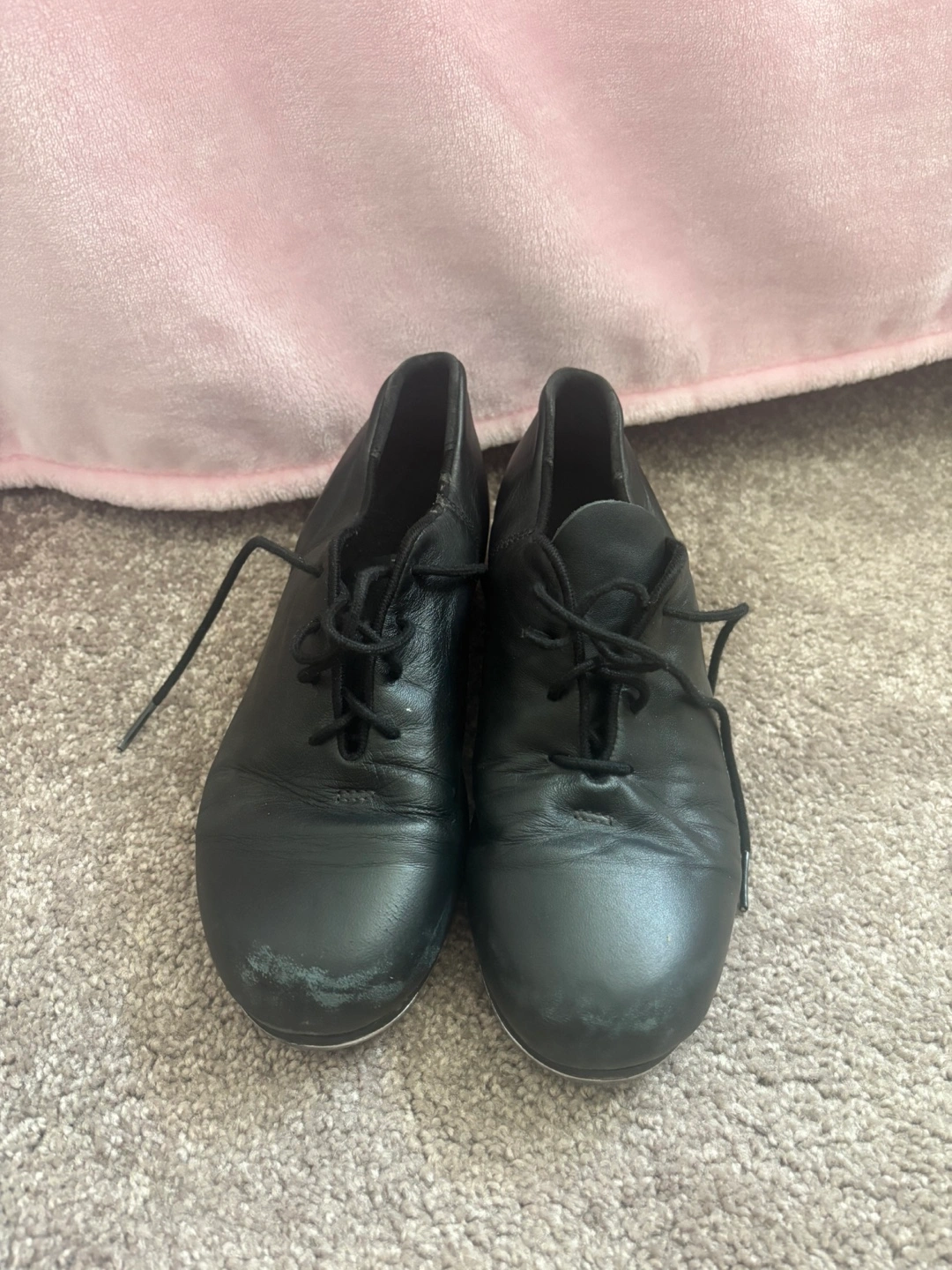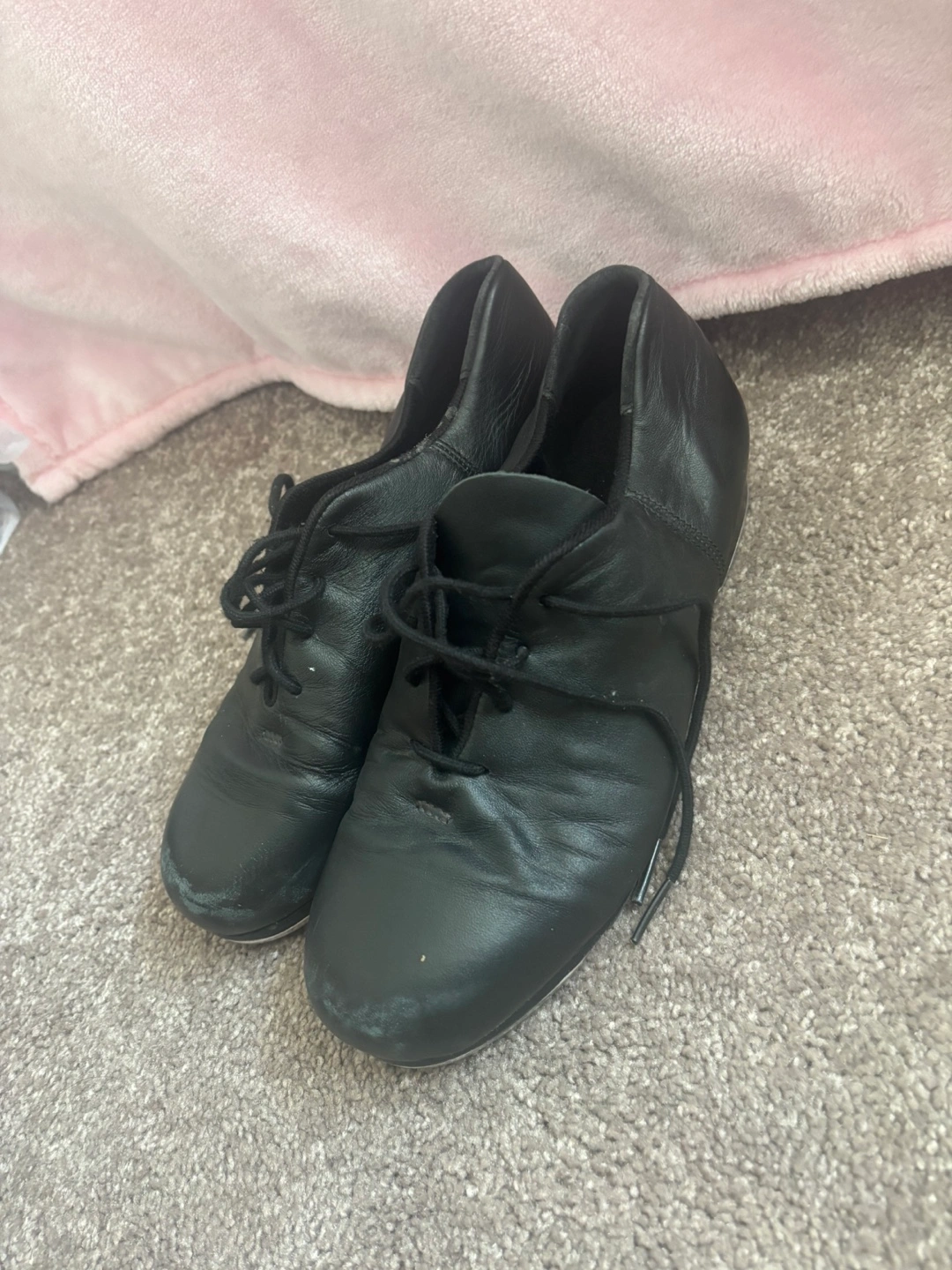 Black leather dance shoes. They feature a lace-up design. They have a rounded toe, and a smooth sole. A calming activity, dancing is the perfect way to spend your free time. Used condition, but good for intermediate dancers.