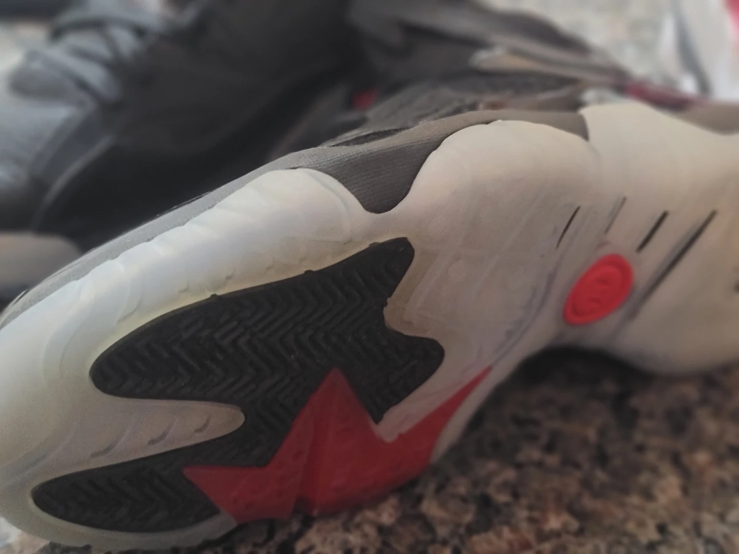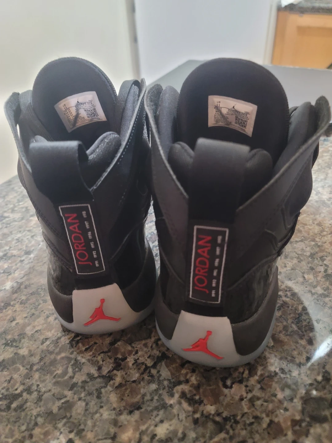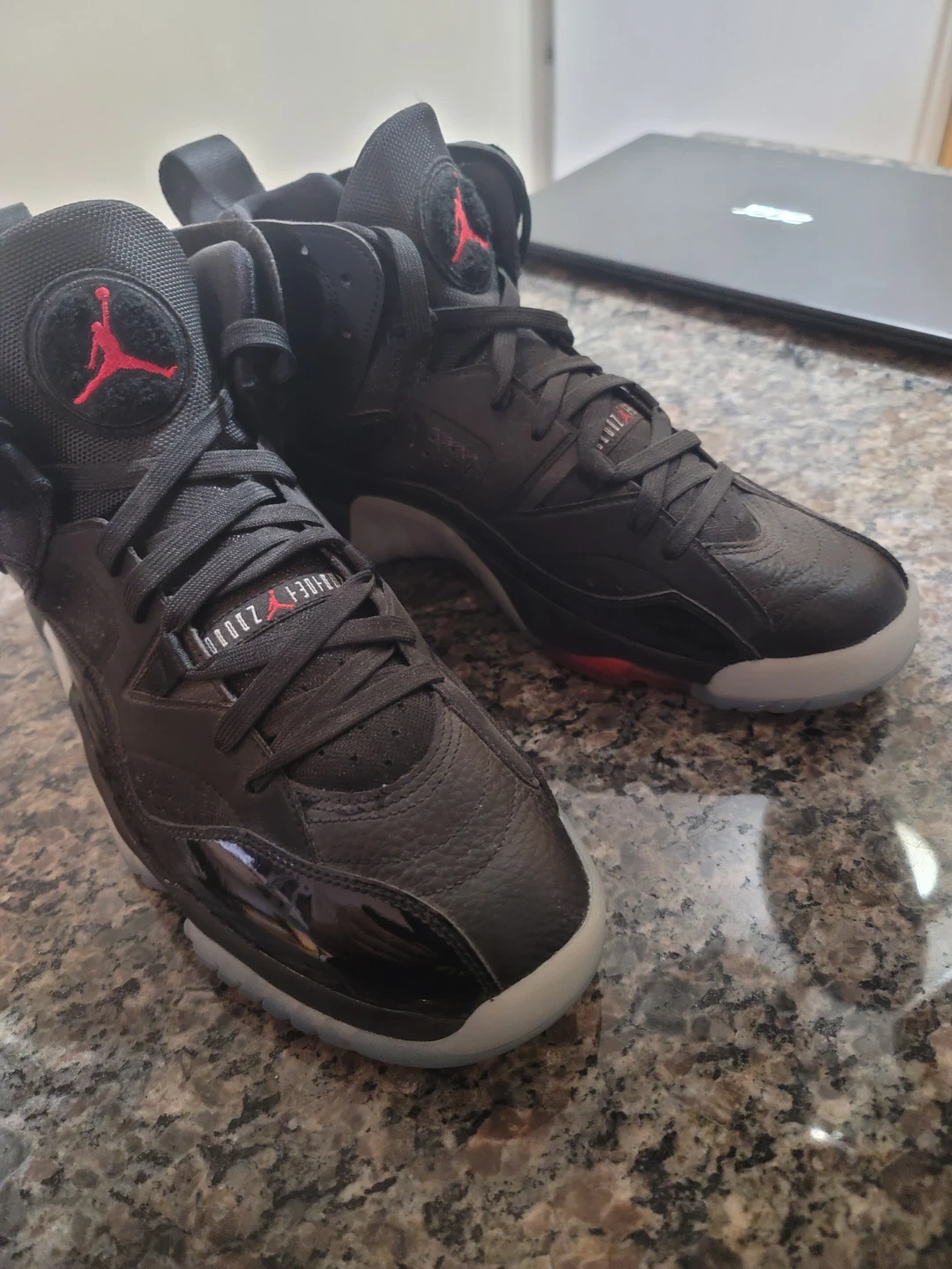 These Jordan shoes are black with red accents and a translucent sole. They feature the Jumpman logo on the tongue and heel. Leather and patent leather details are present. No box, but have never been worn. P/U only. $70.