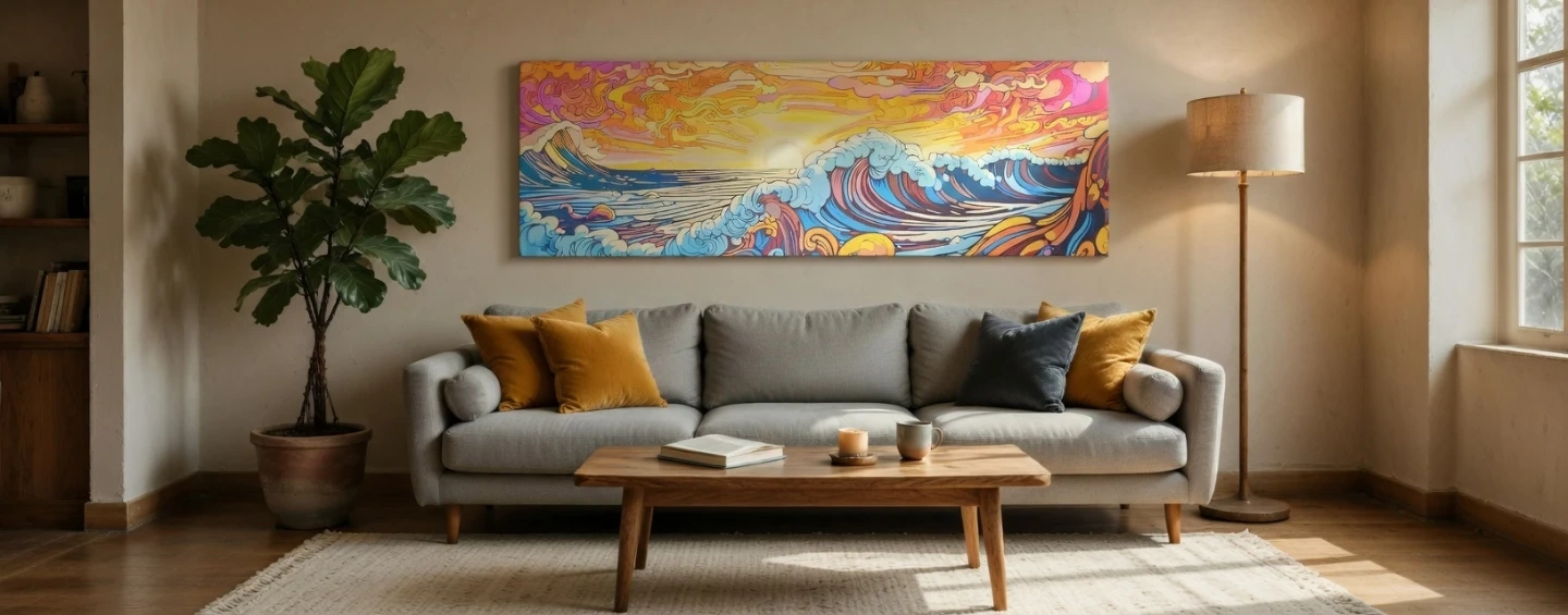 This is a vibrant, panoramic piece of wall art depicting a dynamic ocean wave scene at sunset. The artwork features bold colours and flowing lines, adding a lively focal point to any room. It's ready to hang and enhance your living space!