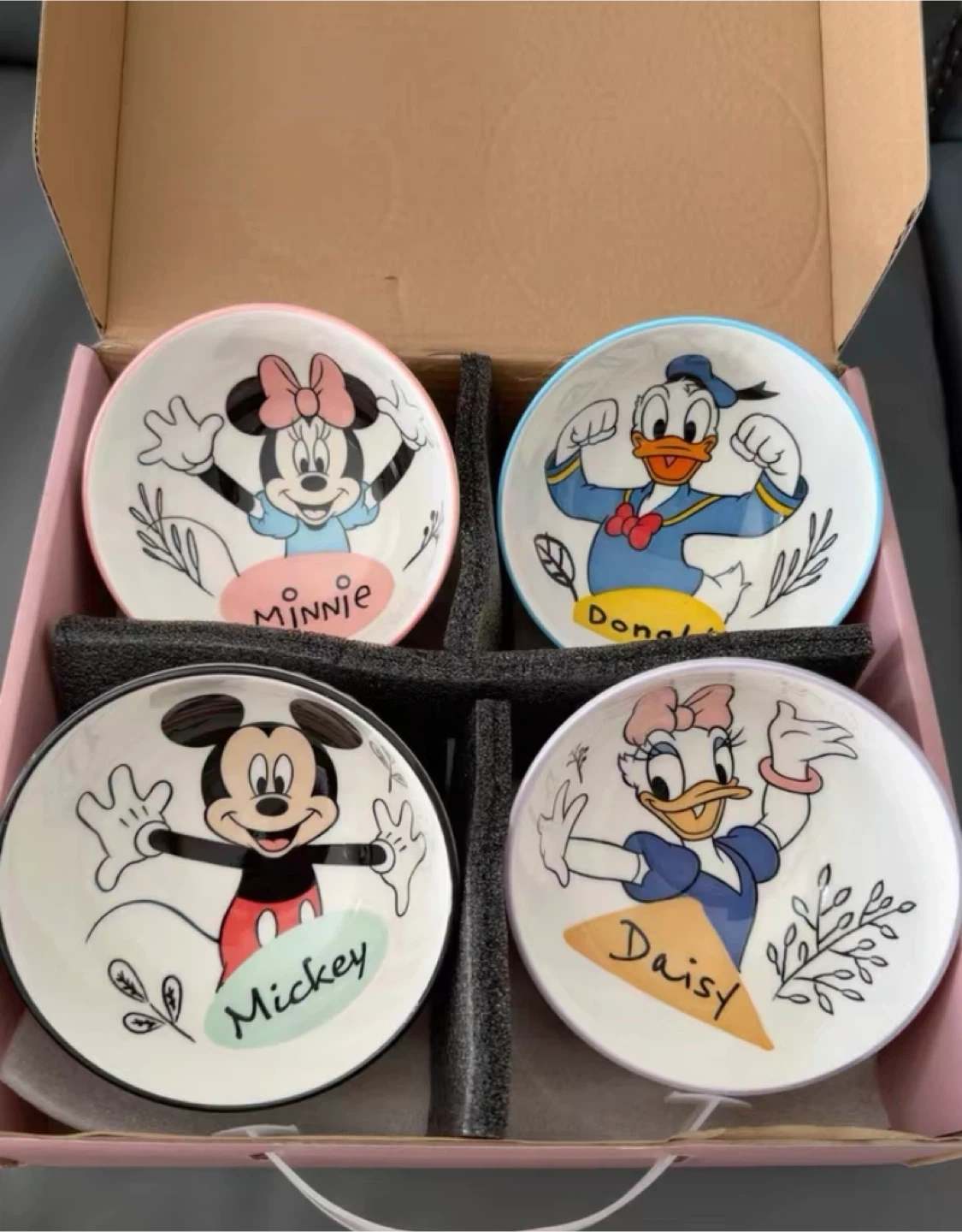 This set includes four small plates featuring beloved Disney characters: Mickey, Minnie, Donald, and Daisy. Each plate showcases a unique character illustration. These ceramic plates are great for snacks or desserts!