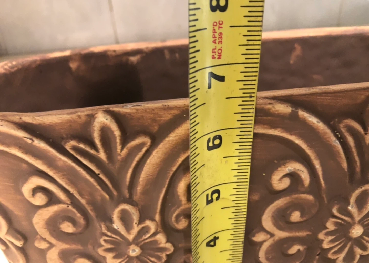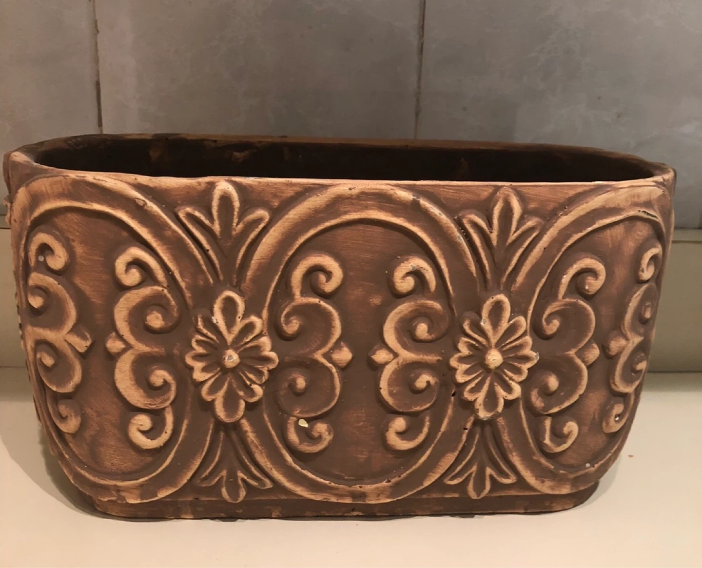 Brown decorative planter with embossed floral design. Measures approximately 8 inches in height and 6 inches in width. It's made of ceramic material. This planter is great for housing small plants indoors.