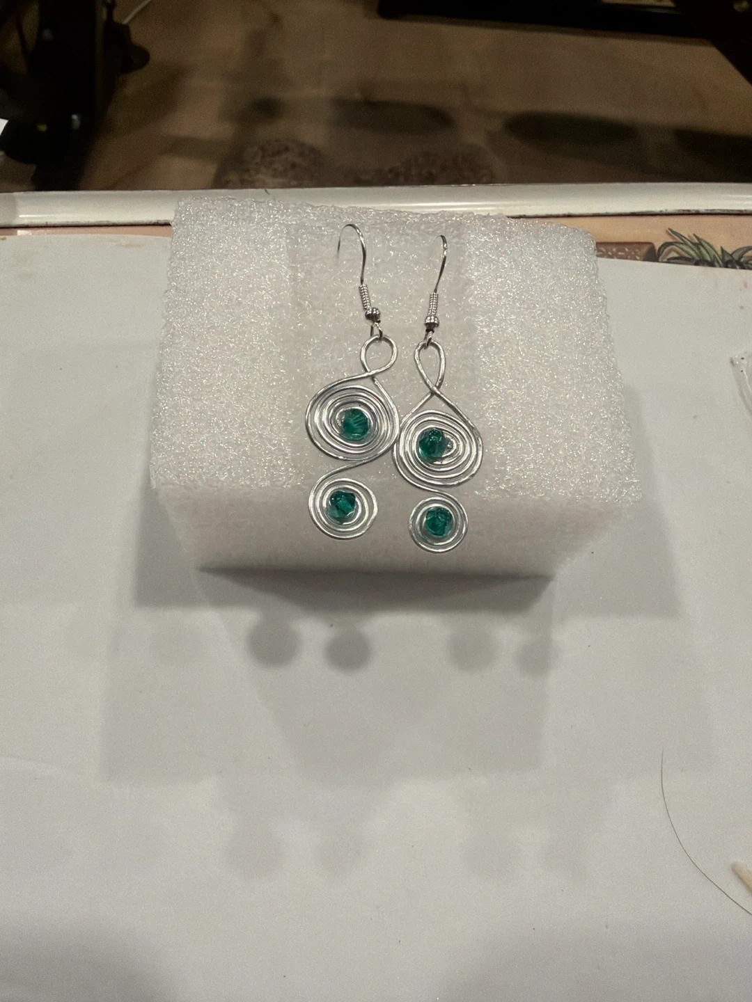 These unique dangle earrings feature silver-toned wire wrapped into a swirl design. Each earring has emerald green gemstone beads. They're lightweight and perfect for adding a pop of colour to any outfit!