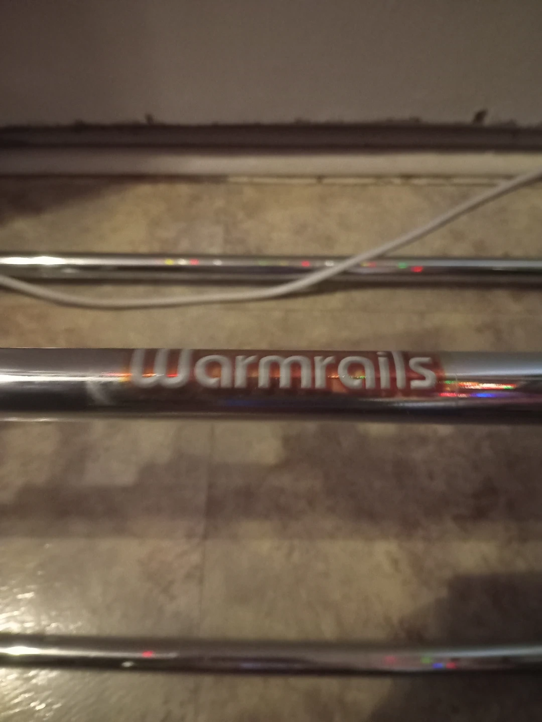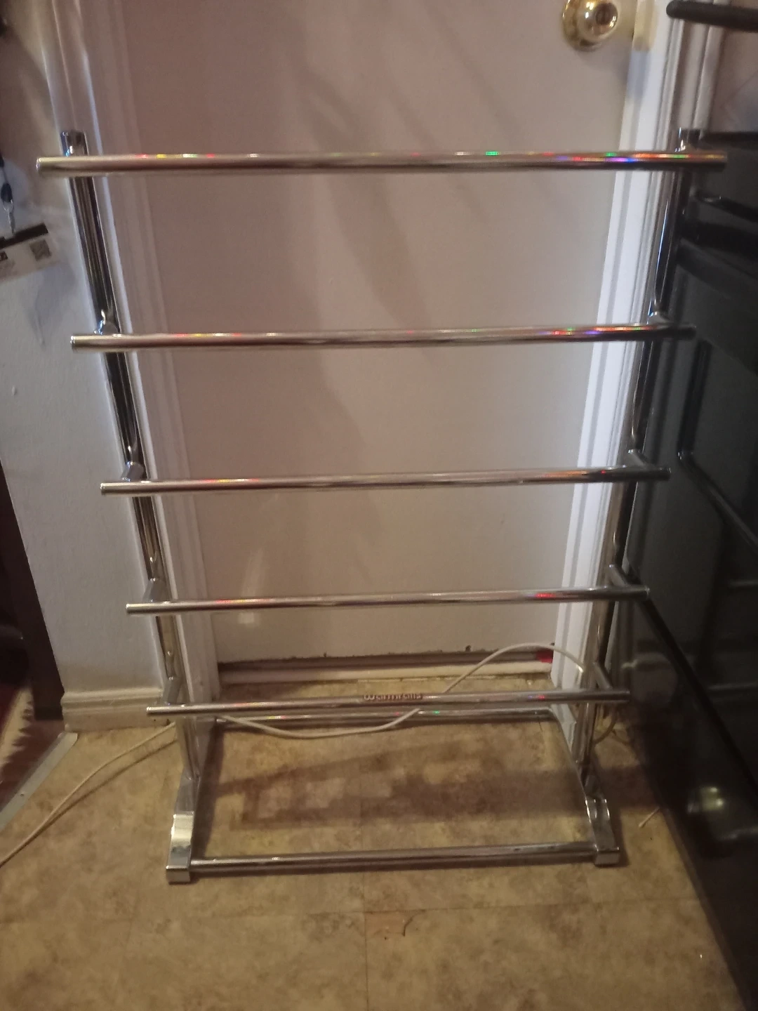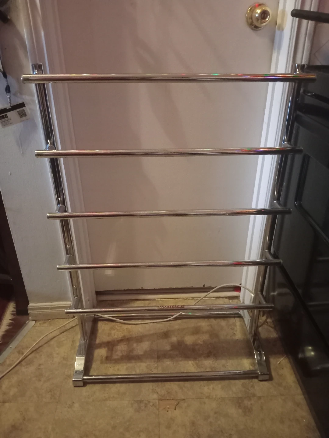 This is a Warmrails heated towel rack. It's made of chrome-plated steel and has six rungs for hanging towels. It's designed to warm your towels asking $50