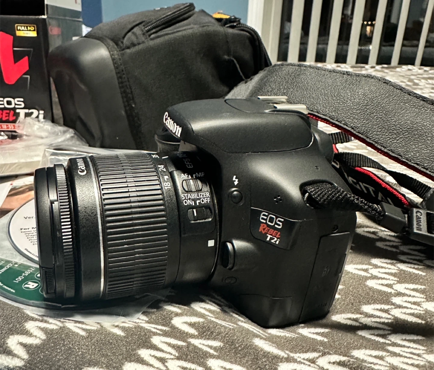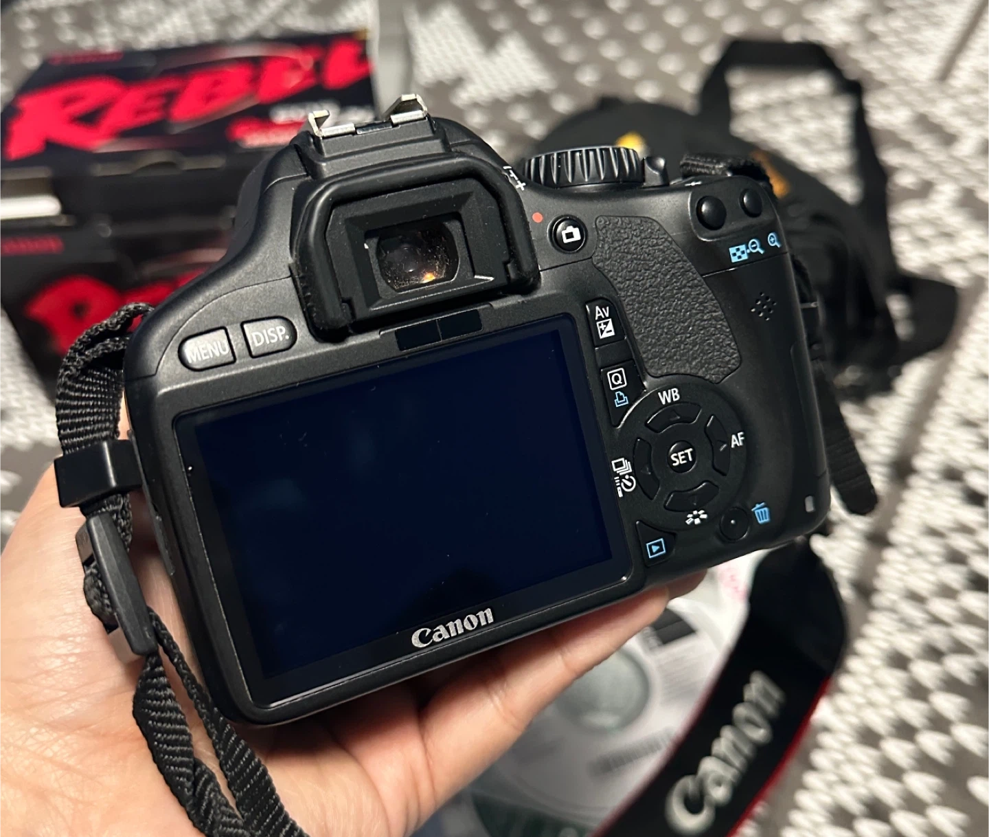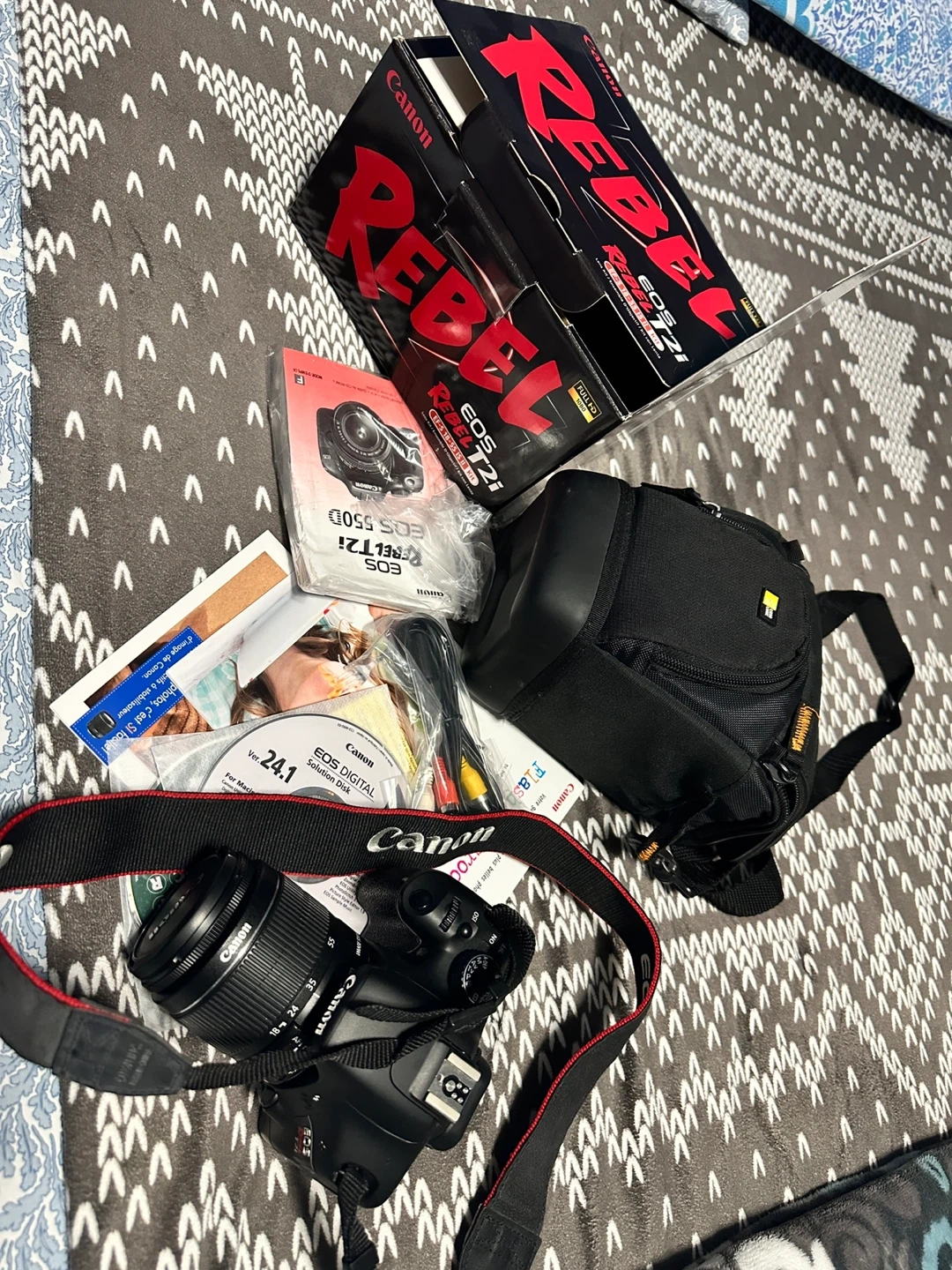 Mint condition. Selling a Canon EOS Rebel T2i DSLR camera. It comes with the EF-S 18-55mm kit lens. Includes the original box, manual, software CDs, battery, charger, and a carrying bag.