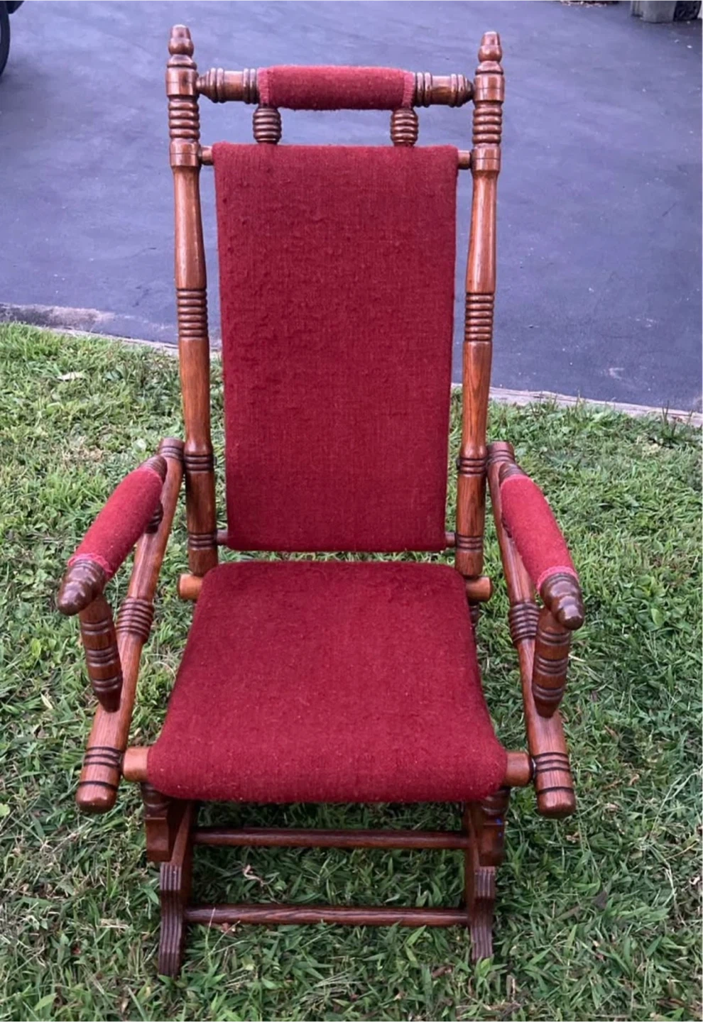 This is a classic wooden rocking chair with deep red upholstered seat and back. It features ornate carvings on the base and turned wood accents on the arms and legs. It's a beautiful piece for any living room! Cash only !