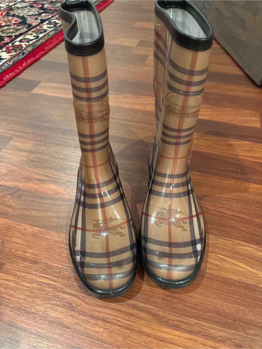 Burberry rubber rain boots with the iconic Nova check pattern. Features black trim and soles. Perfect for keeping your feet dry on rainy days!