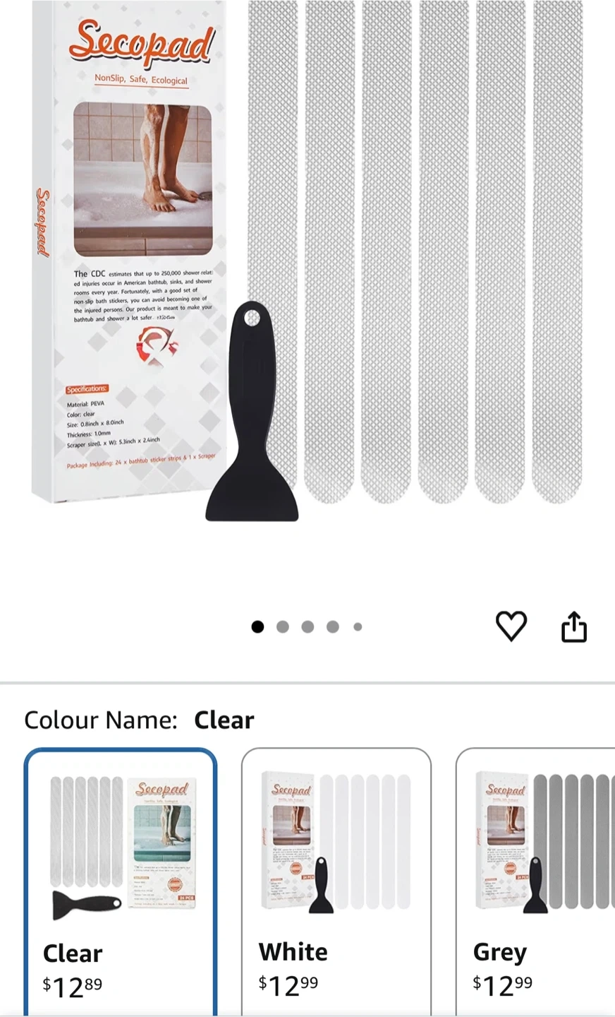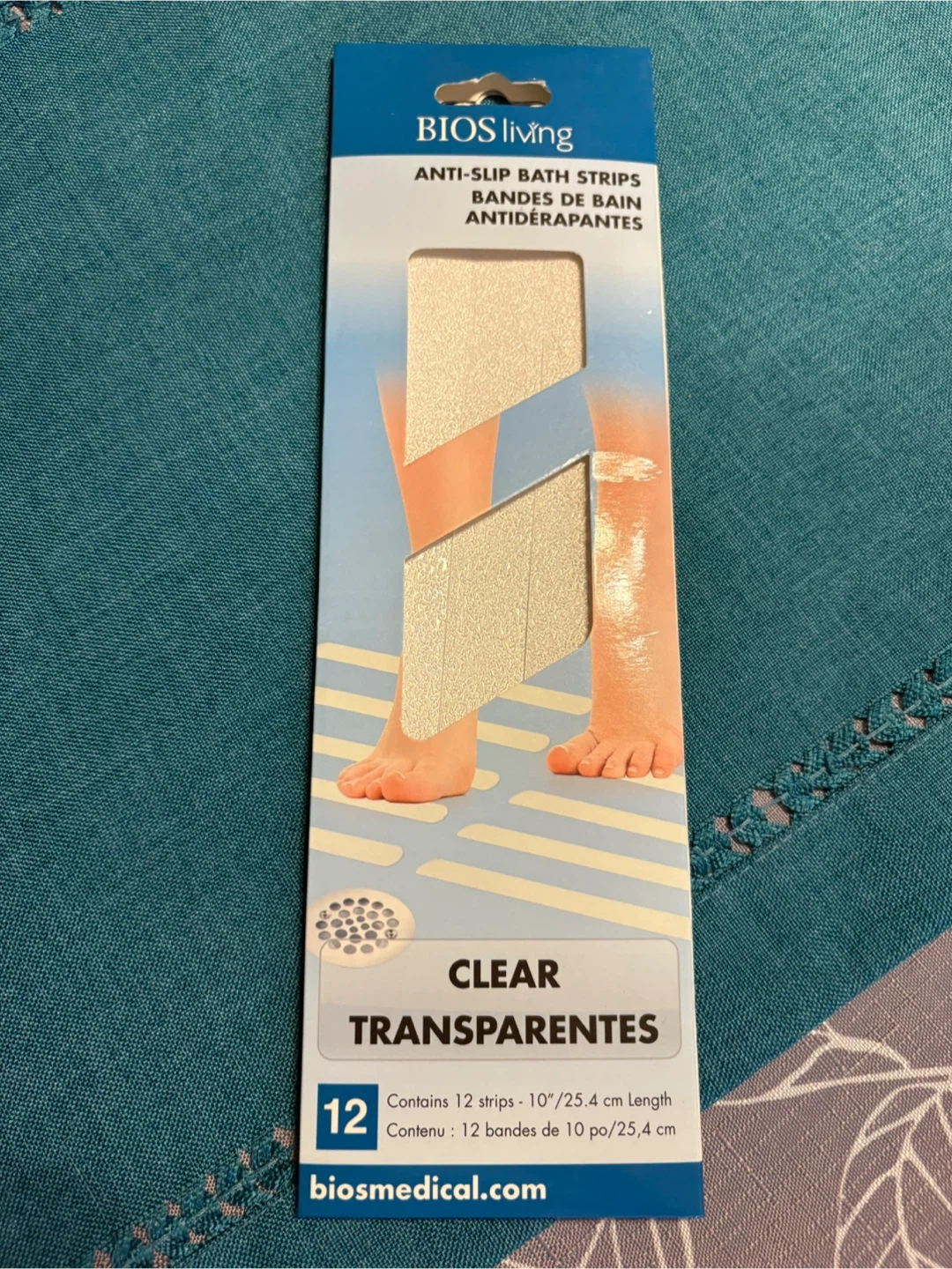 Bios Living anti-slip bath strips designed to add traction to slippery surfaces. Contains 12 clear strips, each 10 inches long. Increases safety in the bathtub or shower.