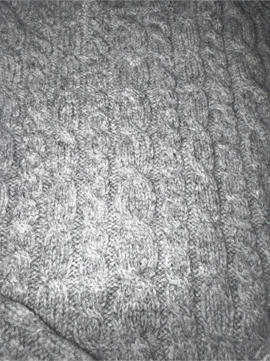 Grey cable knit sweater from Gap. It's made with 98% lambs' wool, 1% Lycra, and 1% other fiber. Size medium.