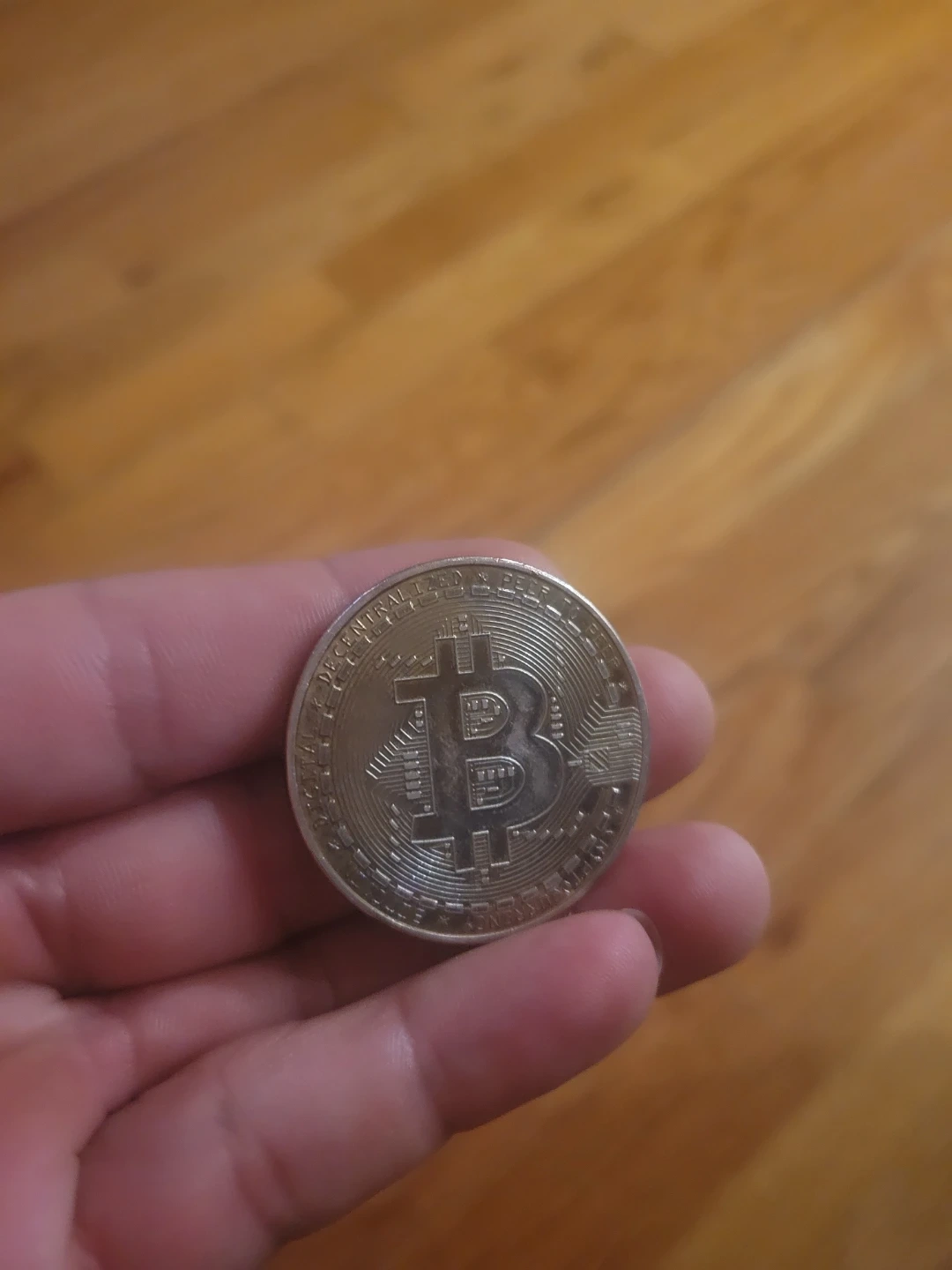 This is a collectible metal coin featuring the Bitcoin logo. It's made of silver-colored metal and has intricate detailing on both sides. A fun item for crypto enthusiasts!