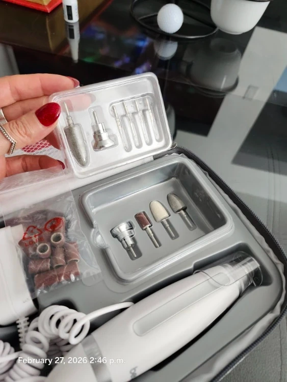 Complete Beurer manicure and pedicure set with multiple attachments and a charging adapter. It includes various filing and shaping bits for nail care. Comes with a convenient travel case.