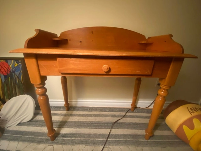 Sturdy little desk in good shape. Some scratches that might be able to cover with a wood product. I gave it a little lemon oil already. Hope it finds a good home and gets lots of use. Widest is 38 1/4”, deepest is 18”, desk top is 30” high. Asking $50. Pickup in Peterborough East end.