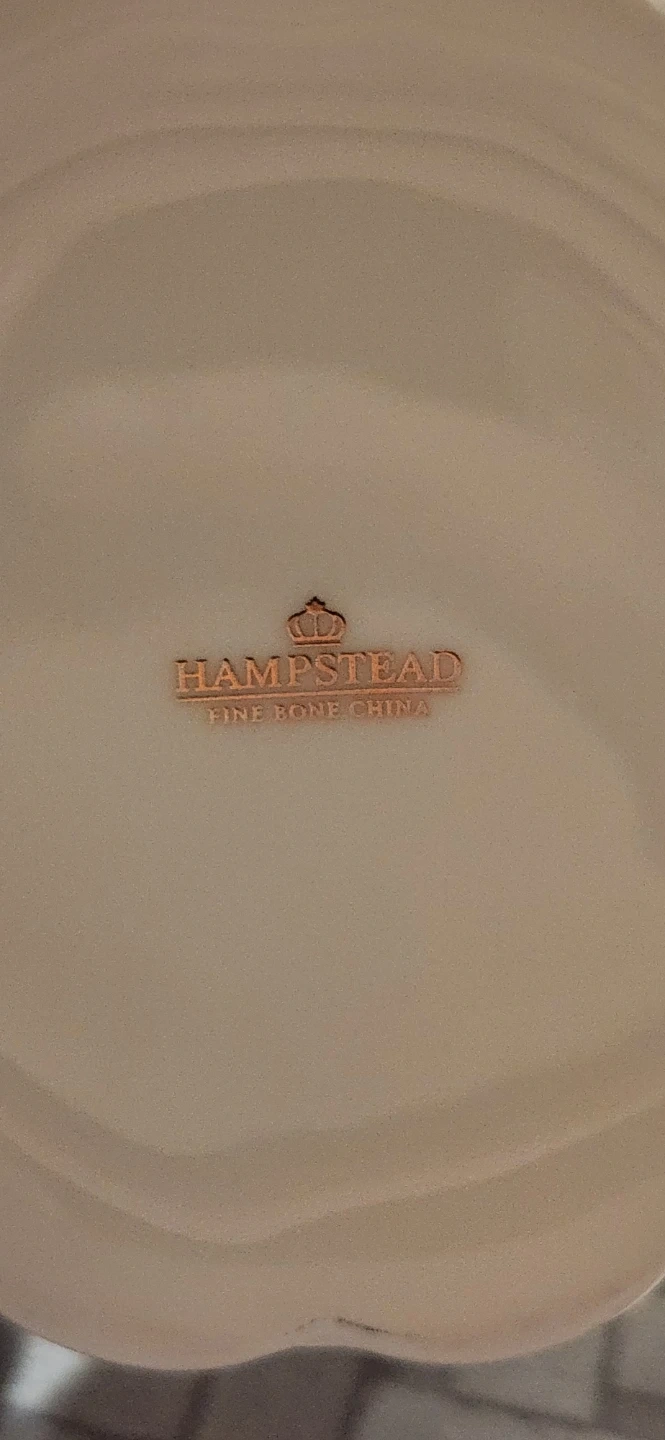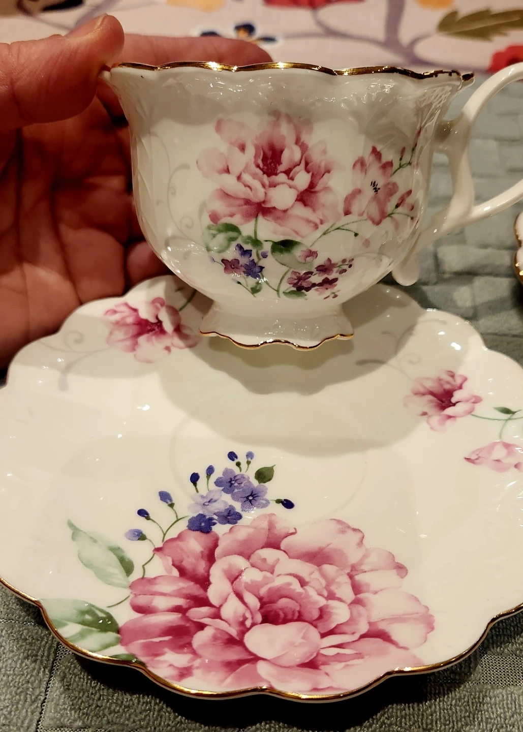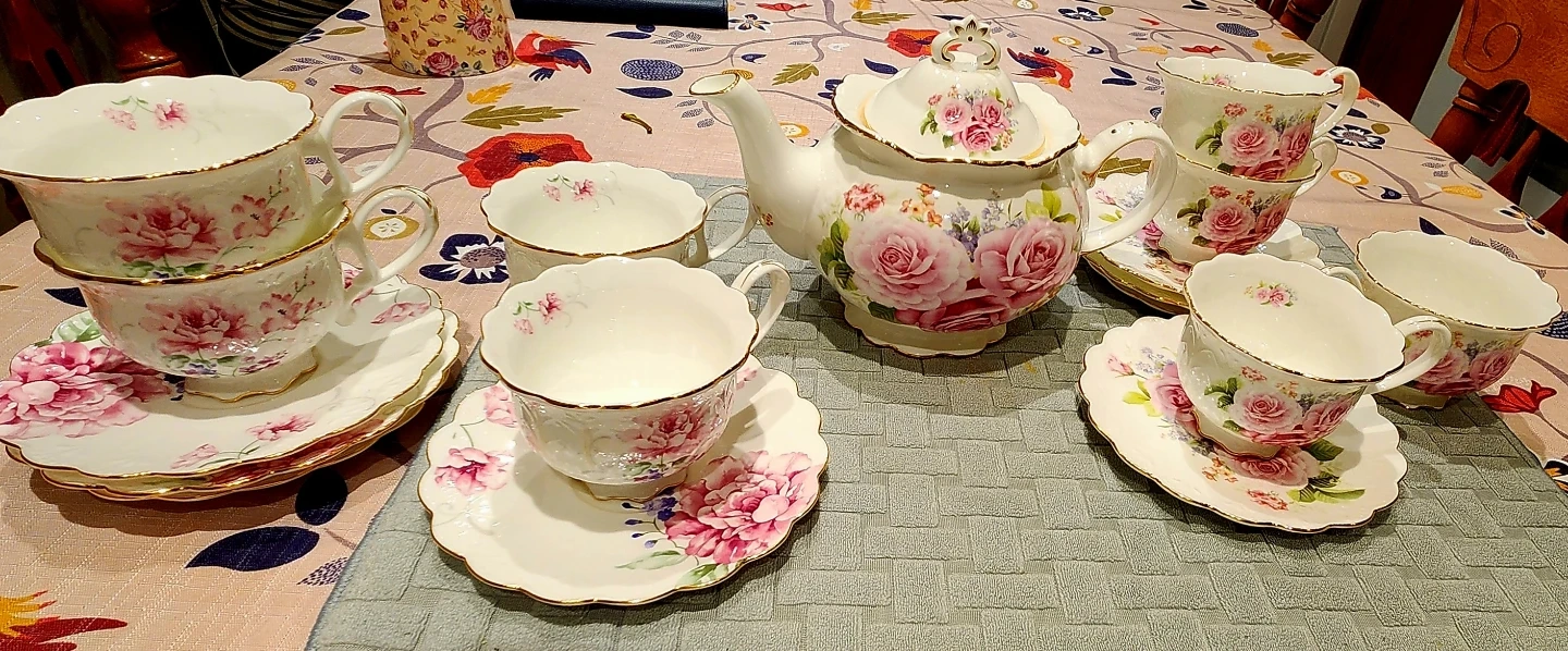 This Hampstead Fine Bone China tea set features a beautiful floral design with pink roses and purple accents. It includes a teapot and multiple cups and saucers. The gold trim adds a touch of elegance to each piece. Set of 8 tea cups and saucers.