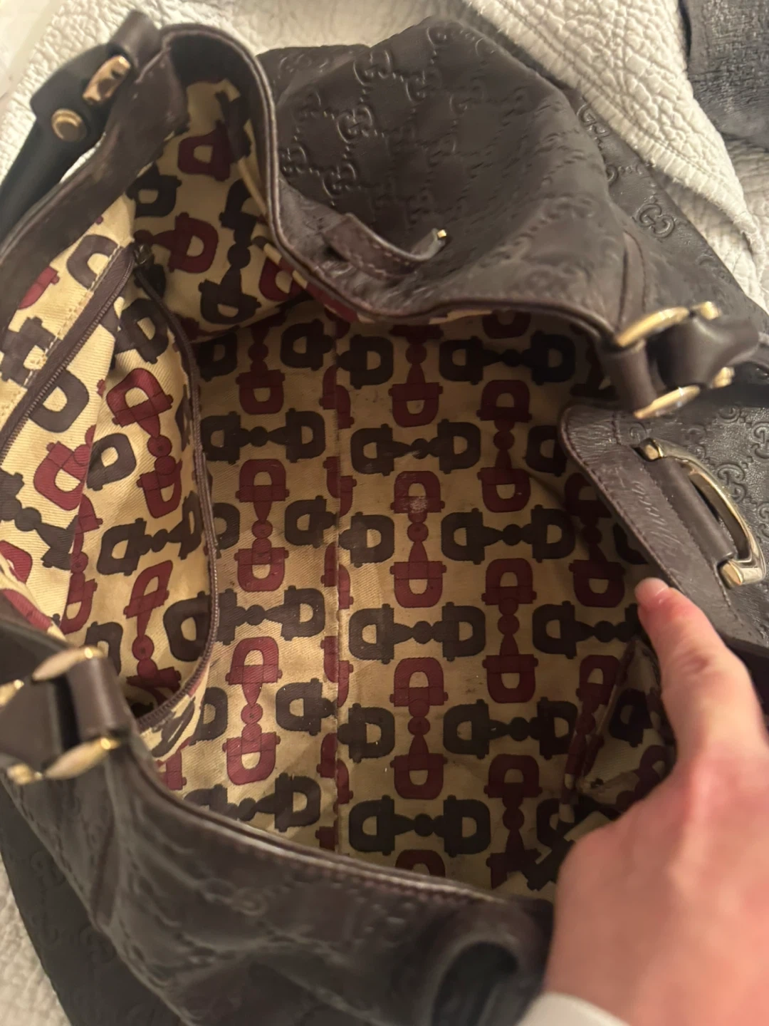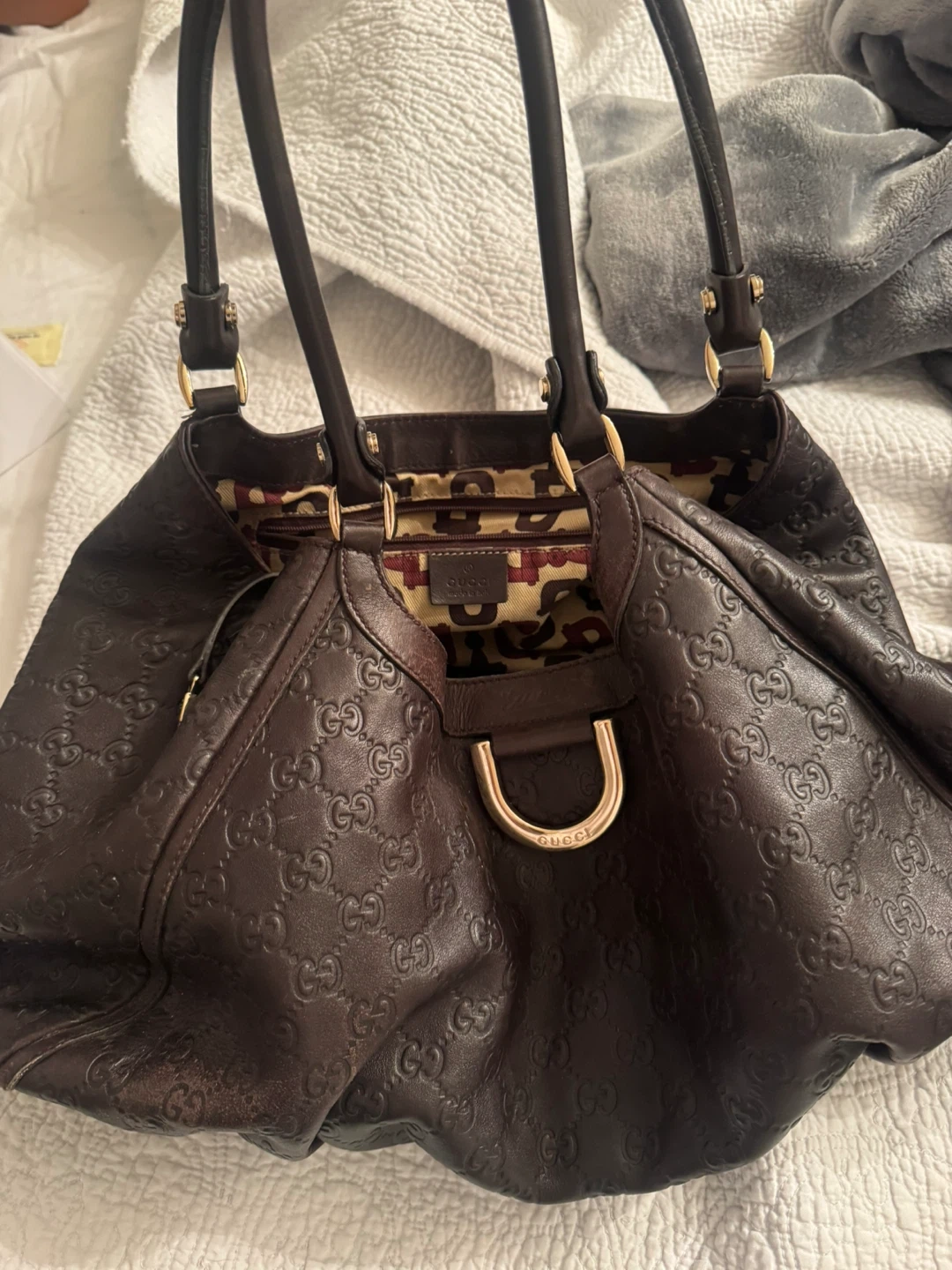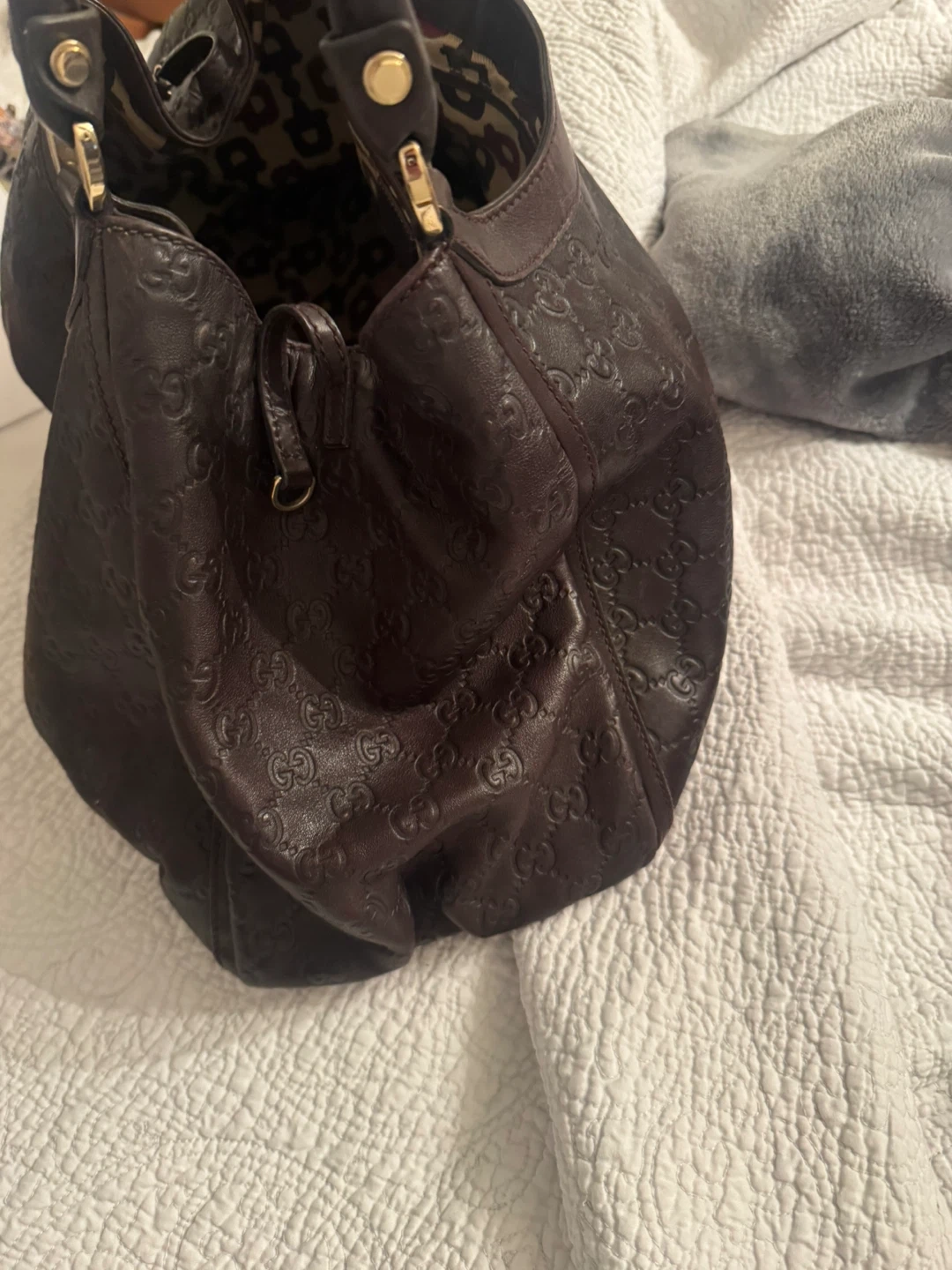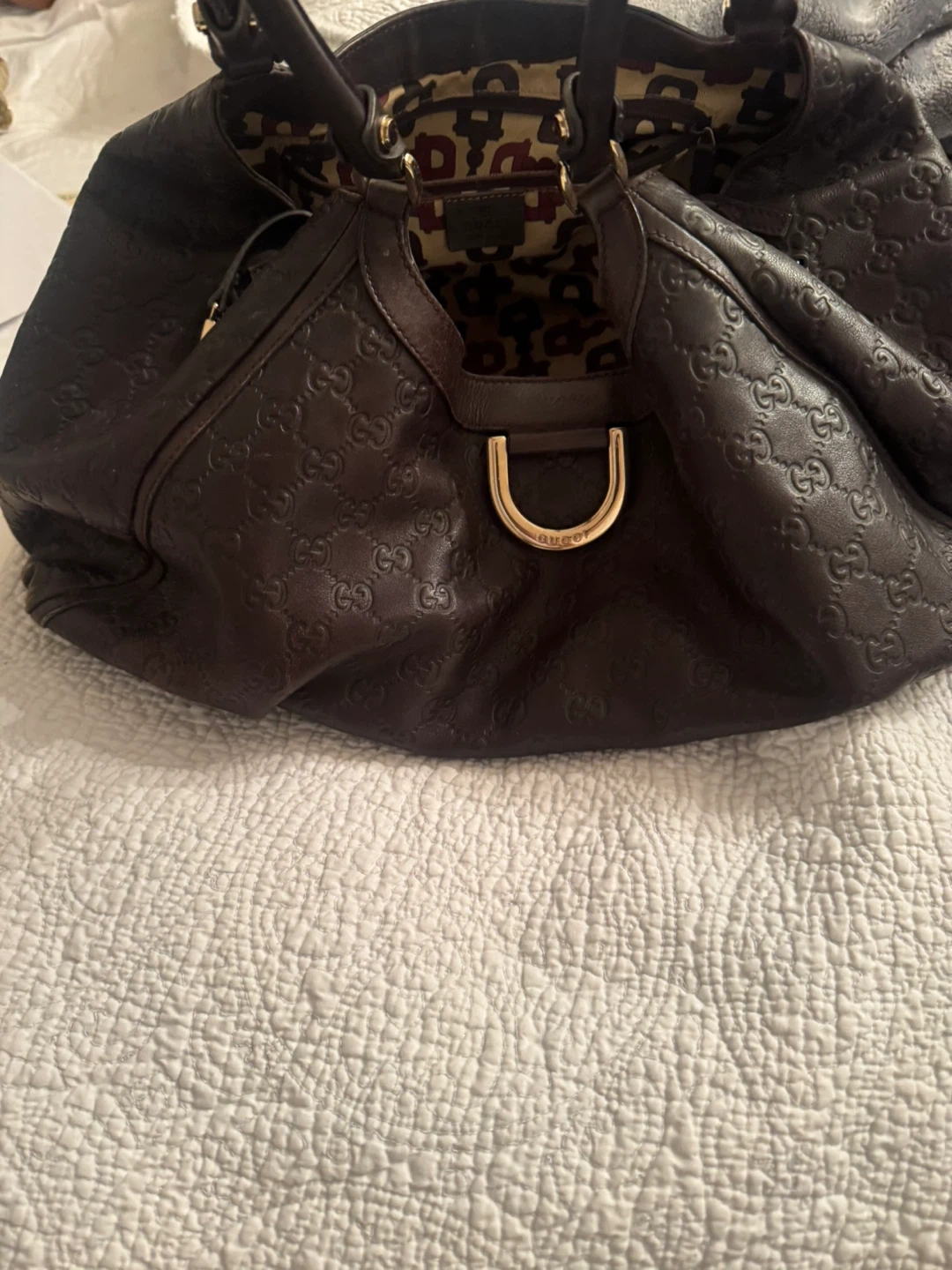 Beautiful Gucci hobo bag in dark brown leather. It features an allover embossed GG logo pattern and a distinctive patterned interior lining. This stylish bag has dual top handles and gold-tone hardware. A great accessory for everyday use!