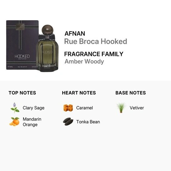Hooked Pour Homme by Rue Broca is a Oriental Vanilla fragrance for men. This is a new fragrance launched in 2024. Top notes are Caramel and Clary Sage; middle notes are Amber, Citrus and Vanilla; base notes are Tonka Bean and Vetiver.