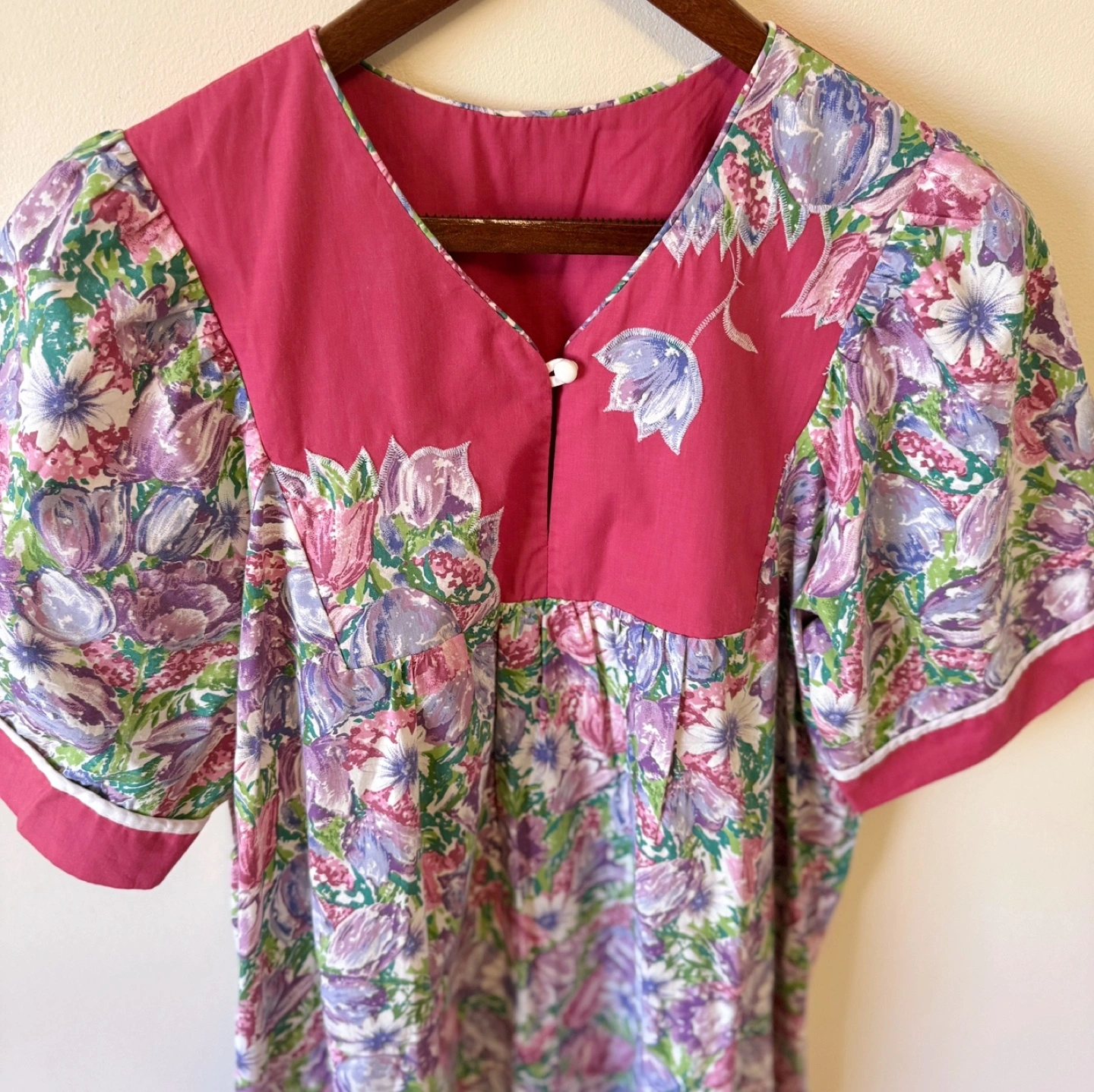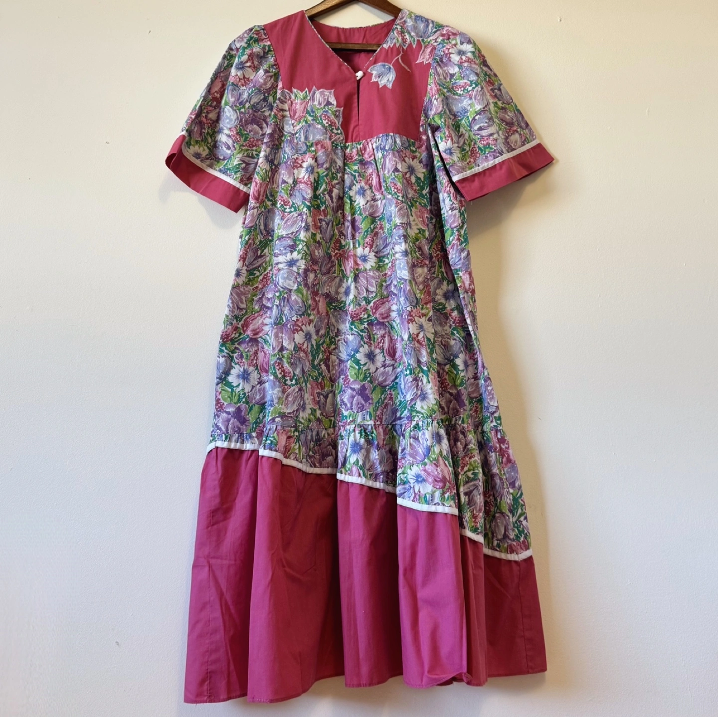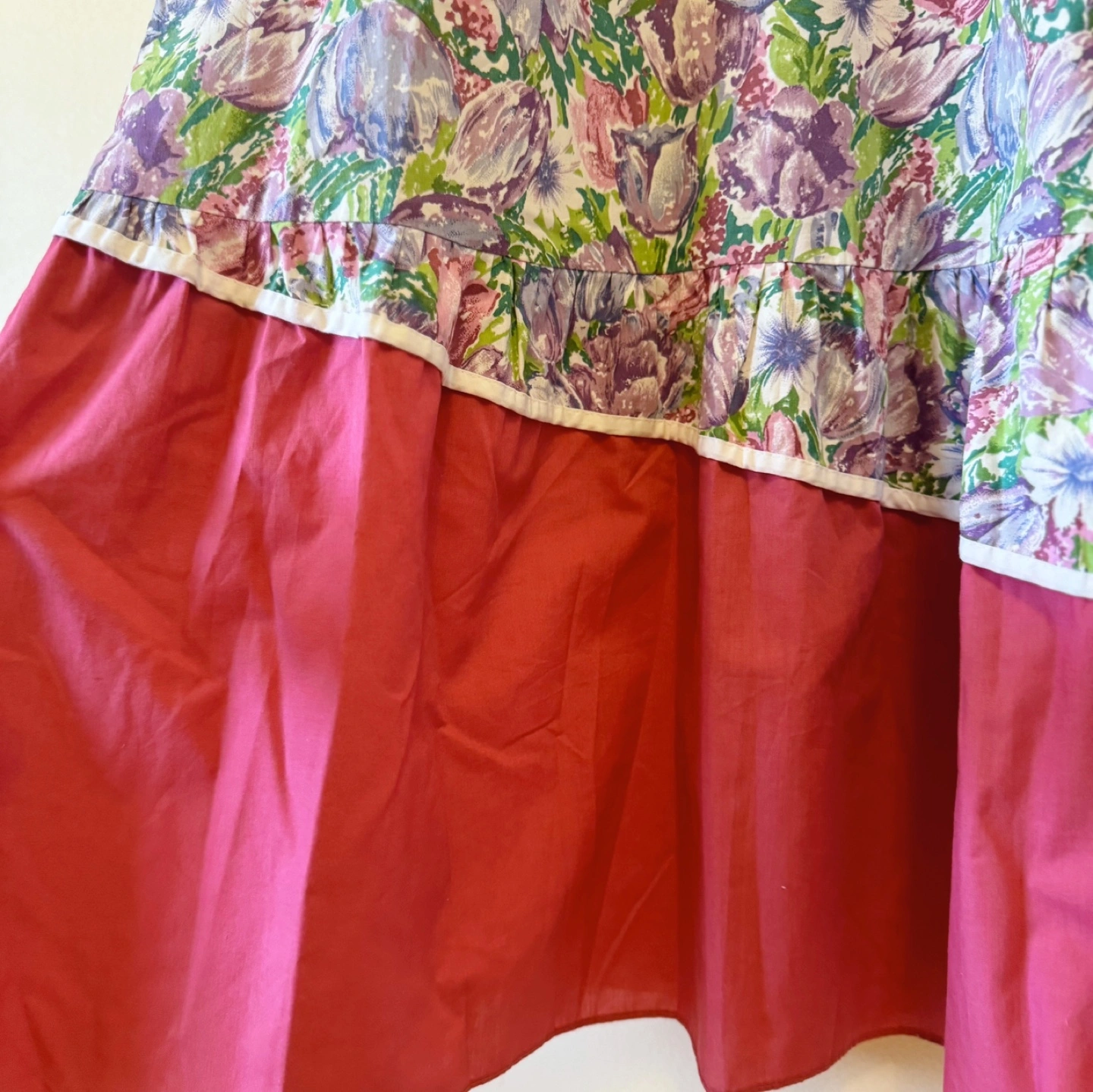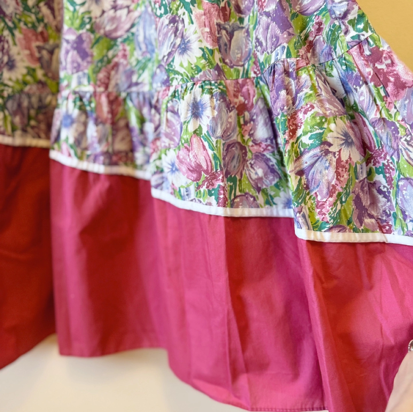A charming vintage prairie-style dress featuring a vibrant floral patchwork design paired with deep rose pink panels. With a flattering high-waisted cut, flutter sleeves, and subtle front embroidery detail, this dress brings a romantic, countryside feel to your wardrobe.