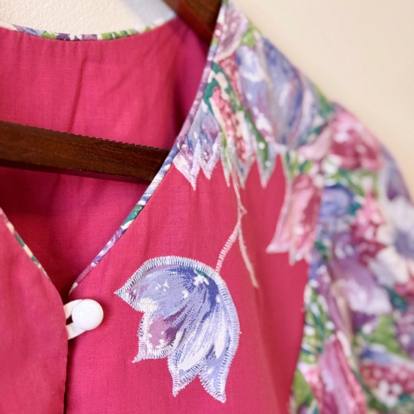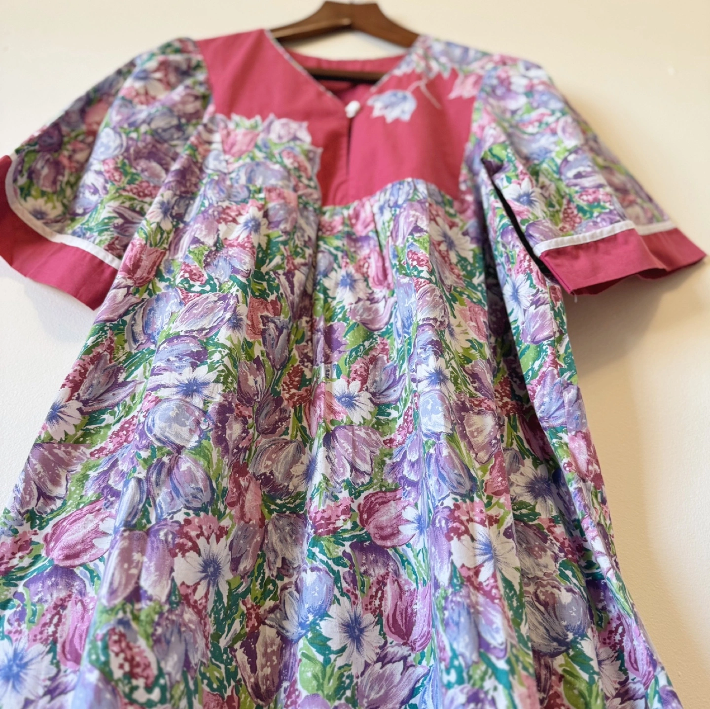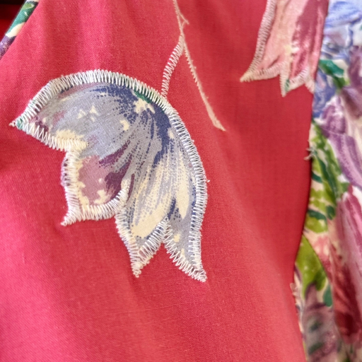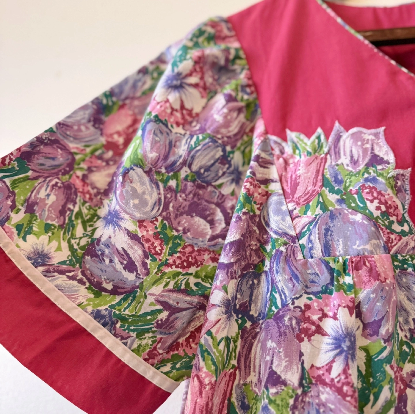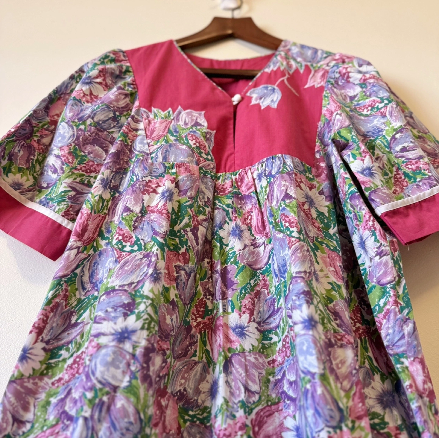 A charming vintage prairie-style dress featuring a vibrant floral patchwork design paired with deep rose pink panels. With a flattering high-waisted cut, flutter sleeves, and subtle front embroidery detail, this dress brings a romantic, countryside feel to your wardrobe.