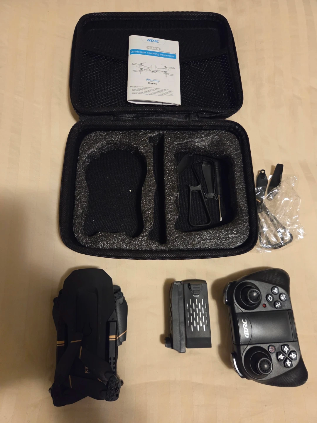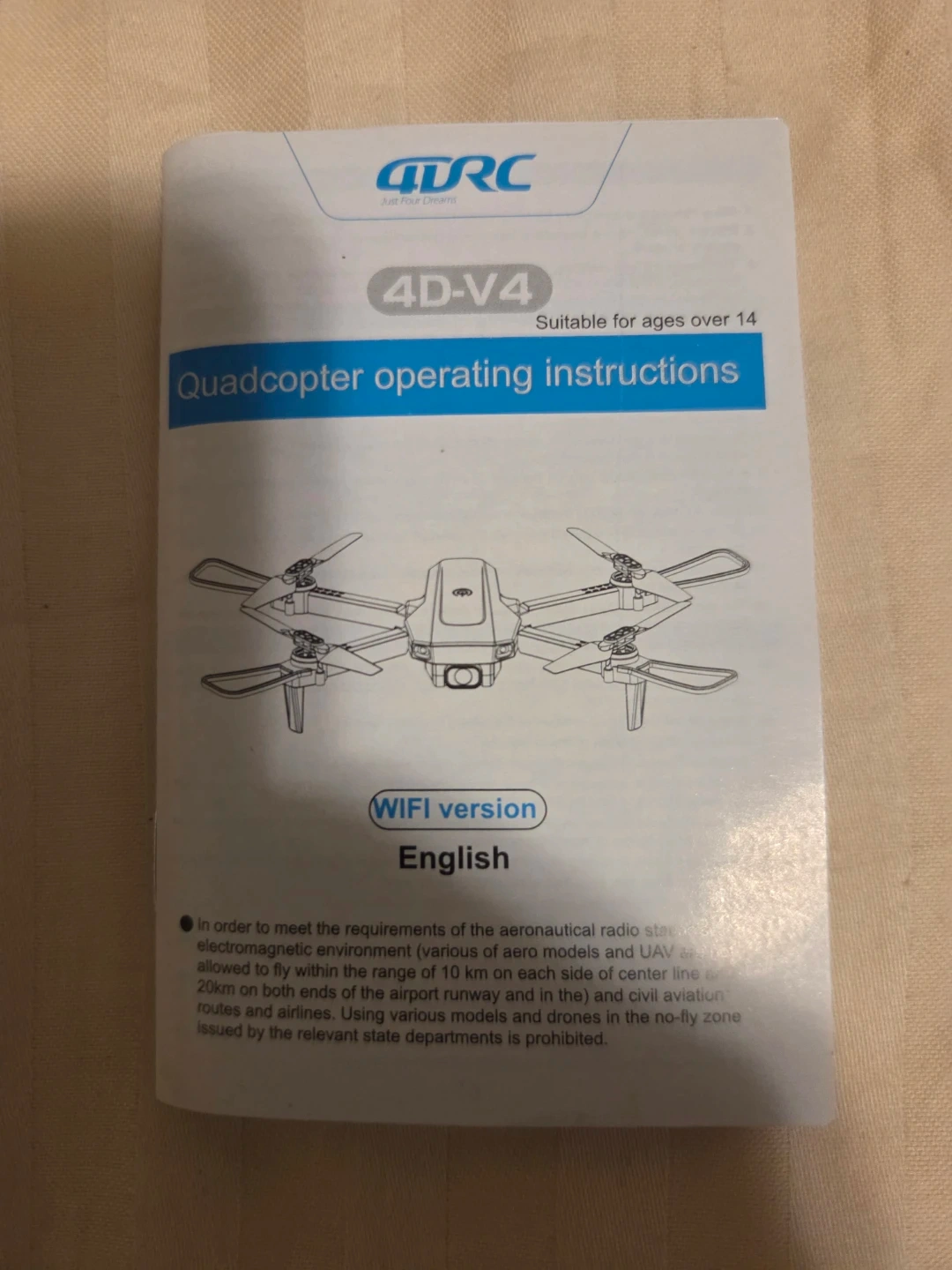This is a GDRC 4D-V4 quadcopter drone. It's the WiFi version and suitable for ages over 14. Includes the drone, controller, charging cable, and carrying case.