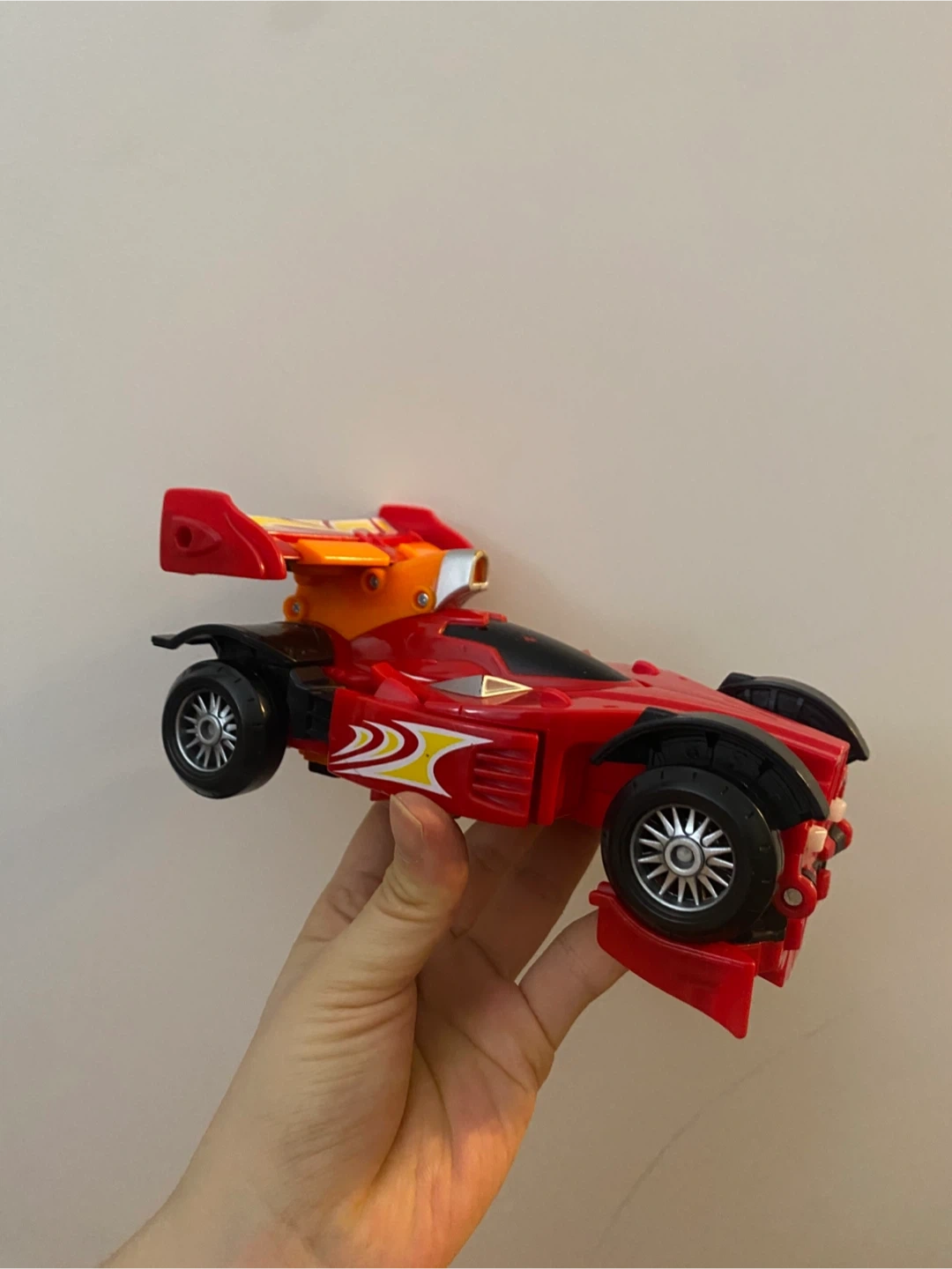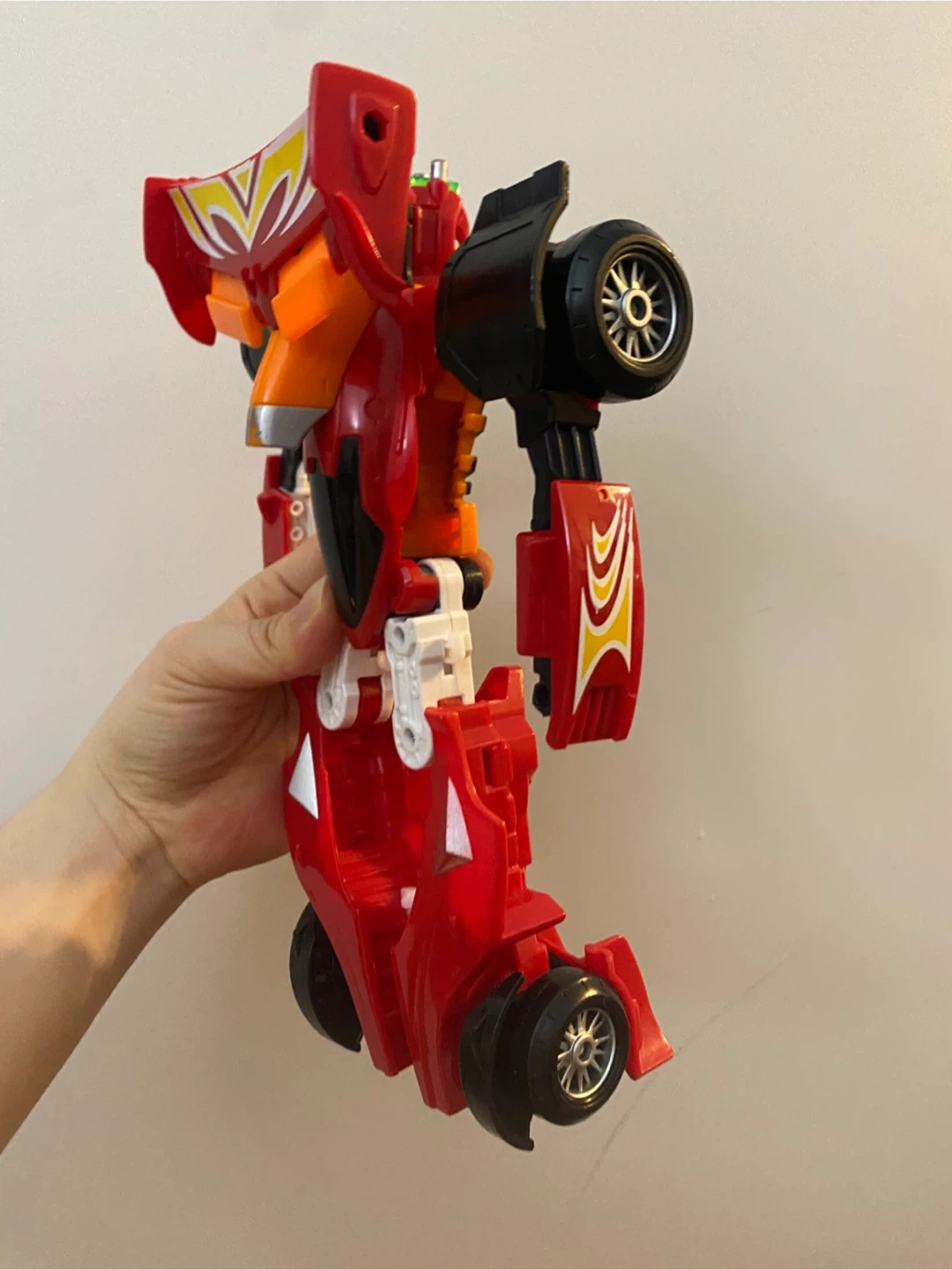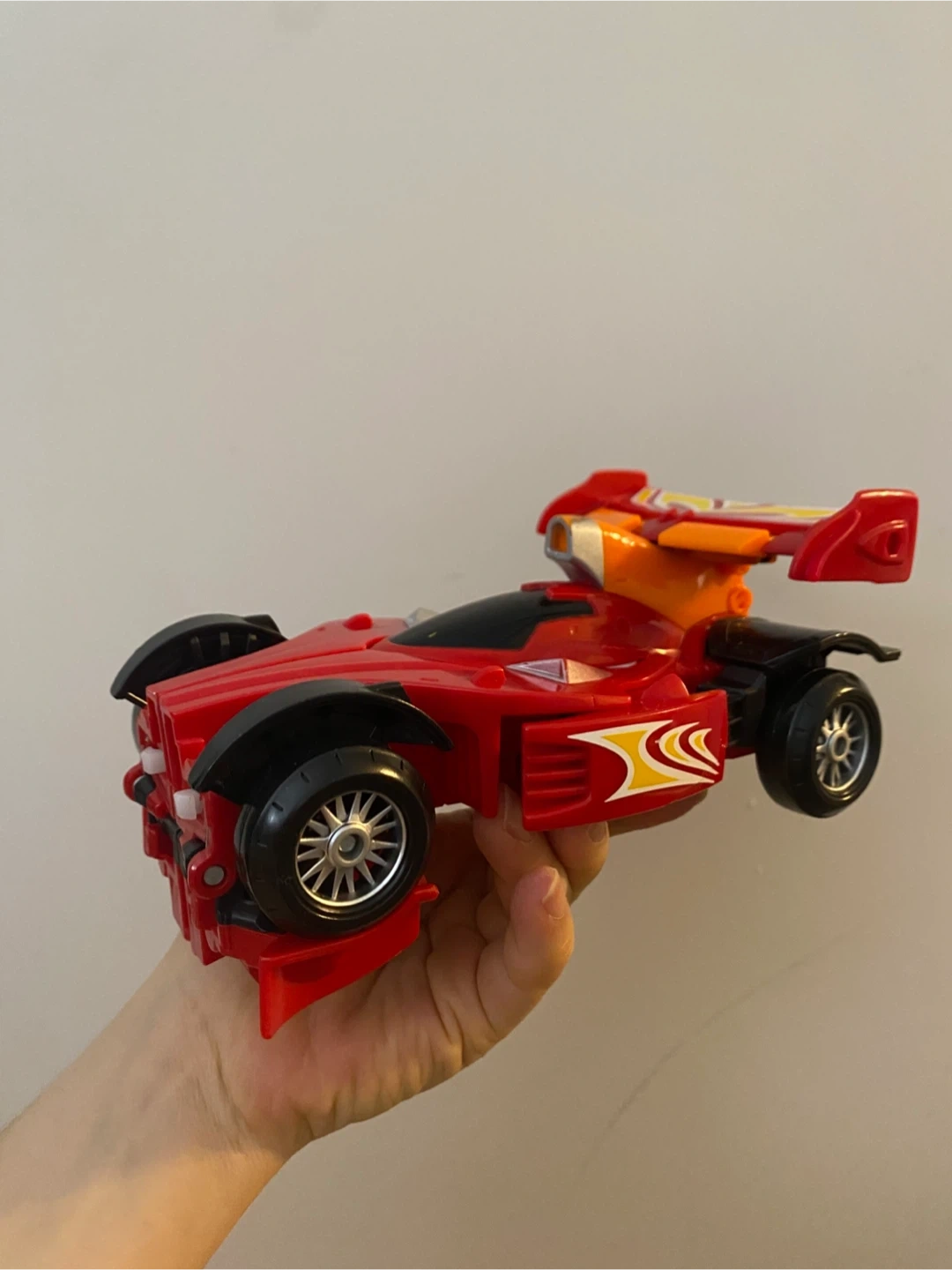 This red toy transforms from a race car into a robot! It features bright yellow and orange accents. Made of plastic, it's ready for transforming action.