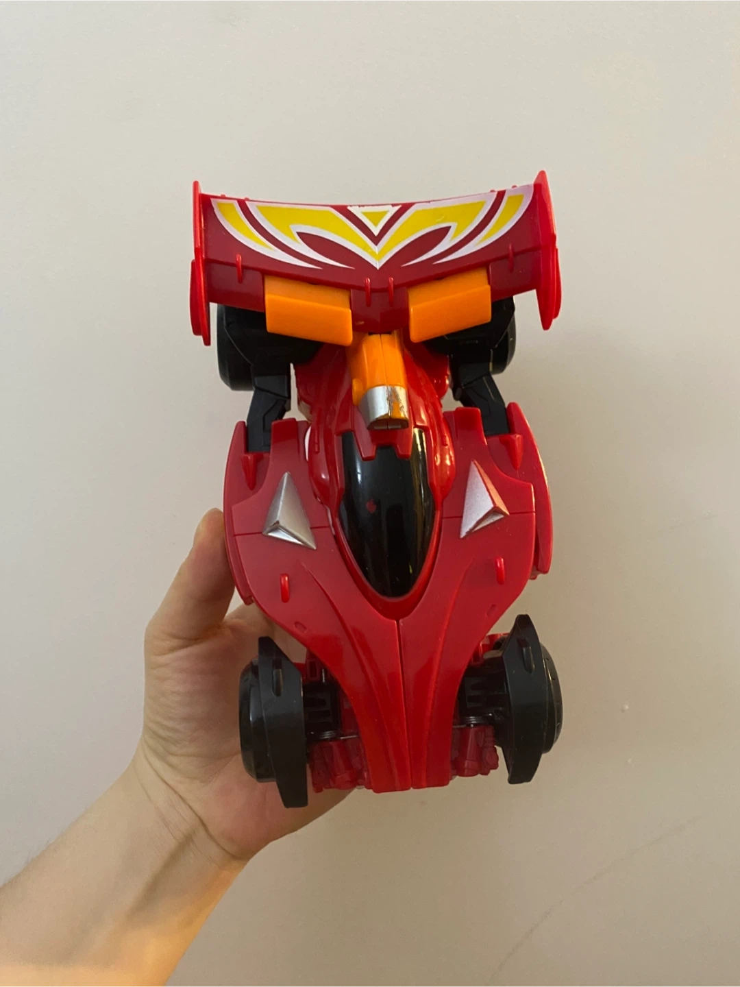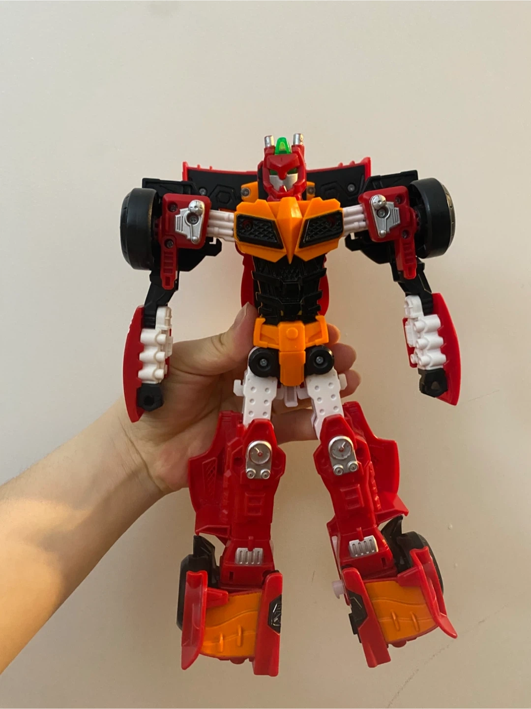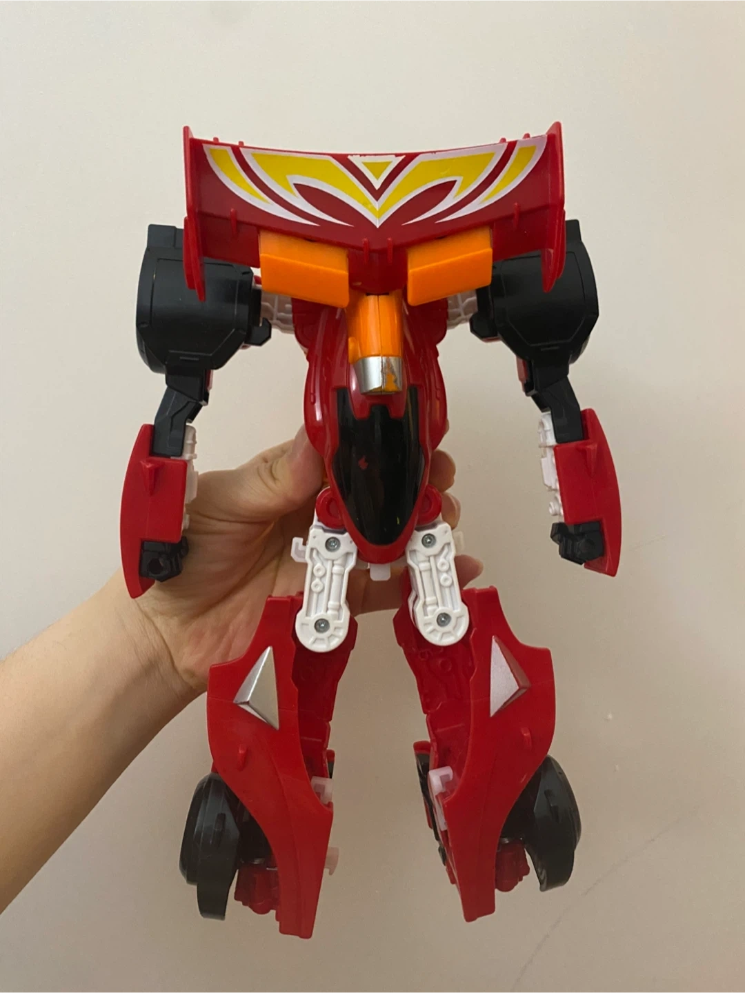This red toy transforms from a race car into a robot! It features bright yellow and orange accents. Made of plastic, it's ready for transforming action.