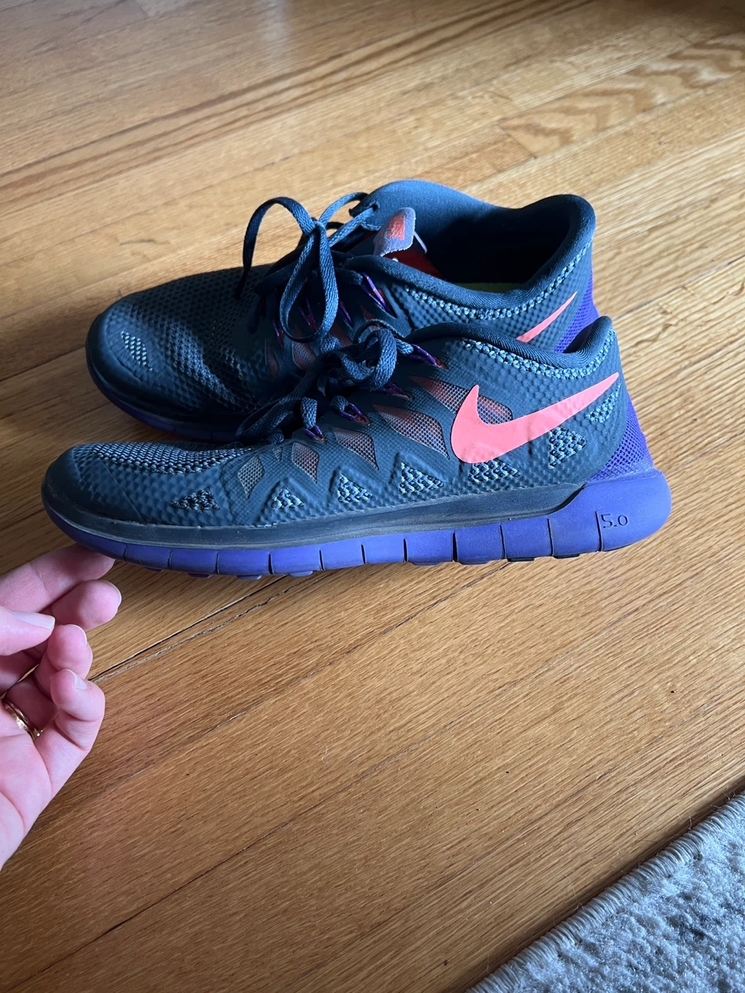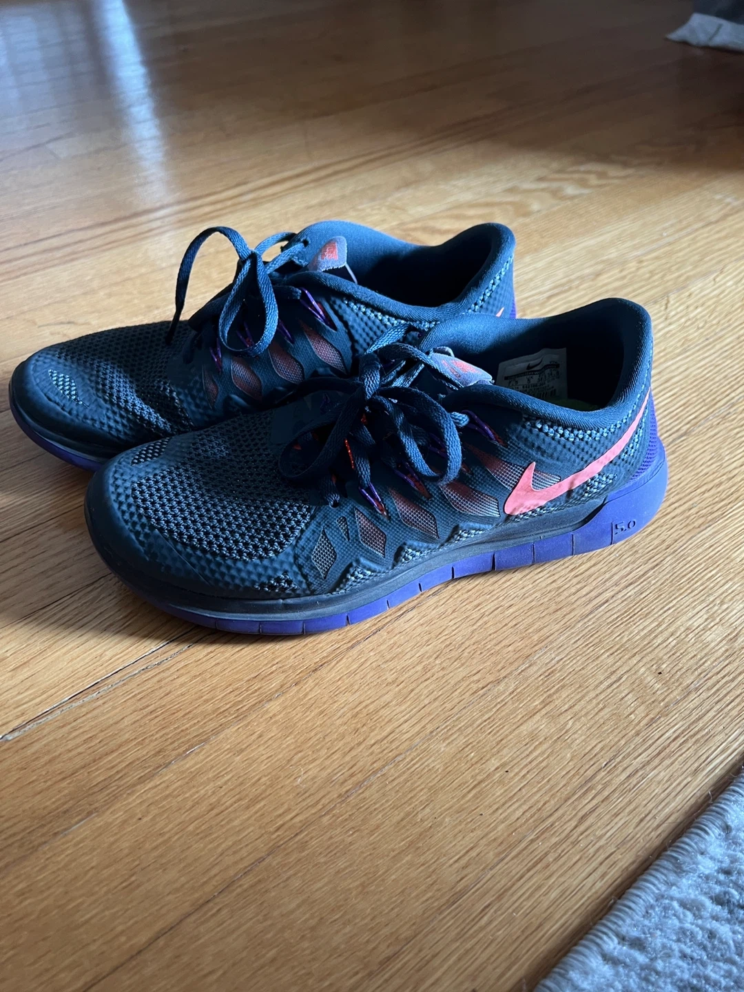 Dark blue and purple Nike Free 5.0 running shoes for women. Size is US 7.5, UK 5, EUR 38.5. These shoes have a mesh upper and a flexible sole.