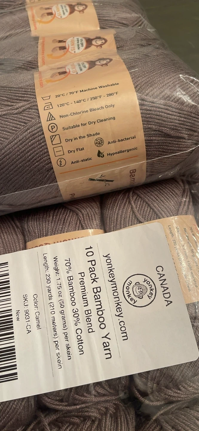 Ten balls of Yonkey Monkey Premium Blend bamboo yarn. It's a 70% bamboo and 30% cotton blend. Each ball weighs 1.75 oz (59 grams) with 230 yards (210 meters) per skein. This yarn is dry-cleanable, anti-bacterial, and hypoallergenic. It's suitable for dry cleaning and can be dried flat.