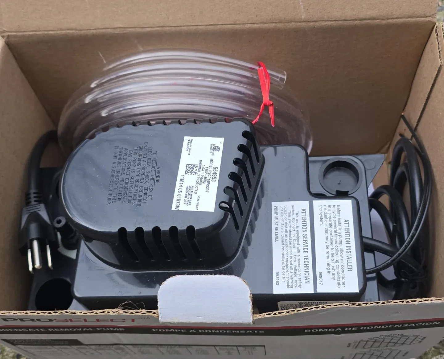 This is a ProSelect condensate removal pump, model PSCP15WS20T. It's thermally protected and designed for indoor use only. The pump is suitable for gas furnace condensate applications. BNIB
