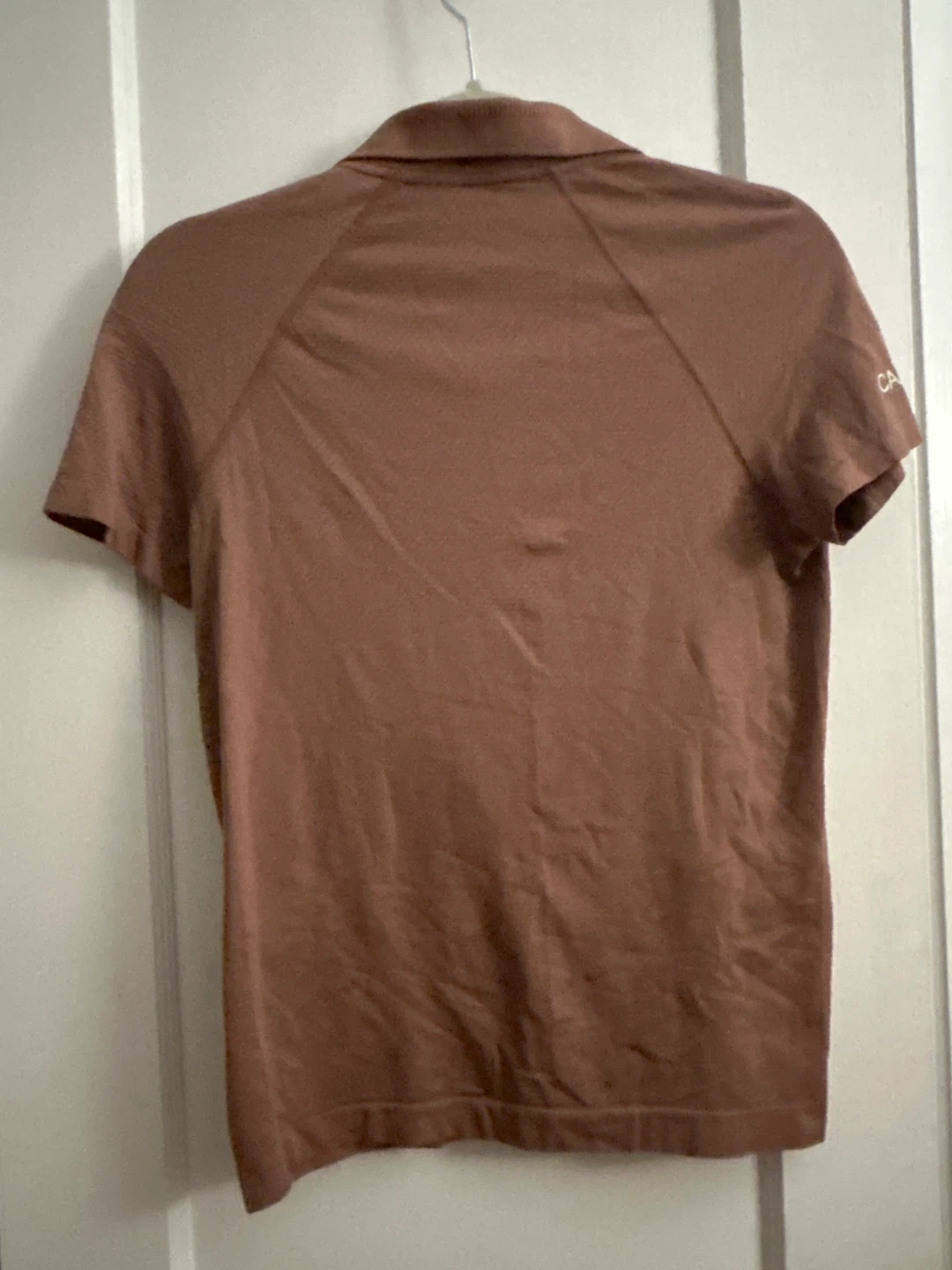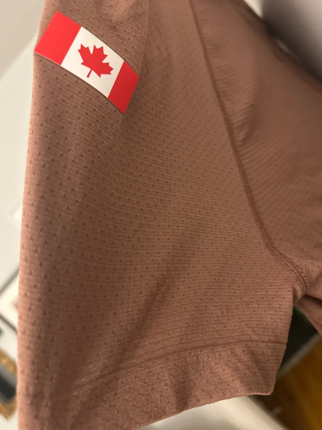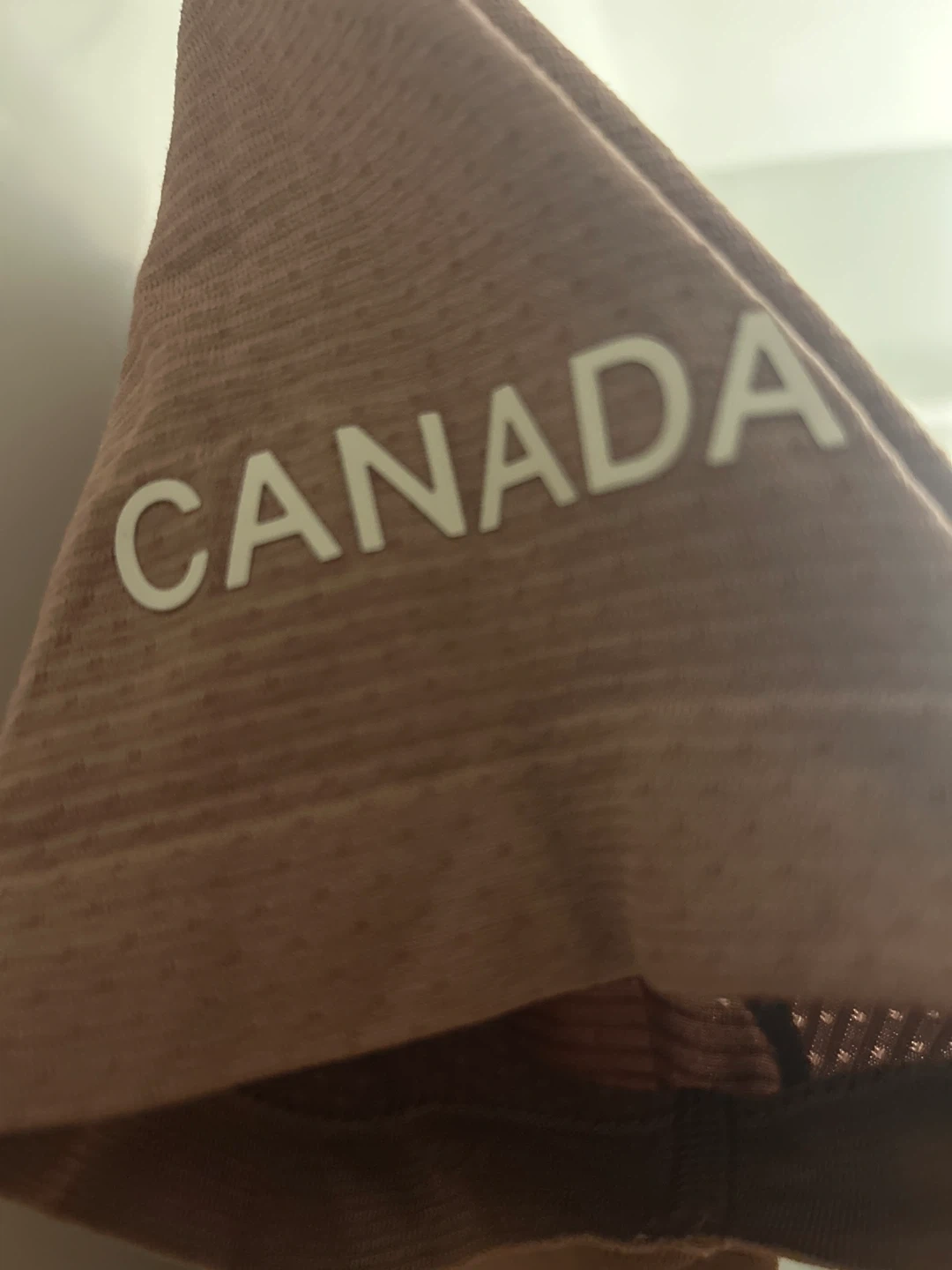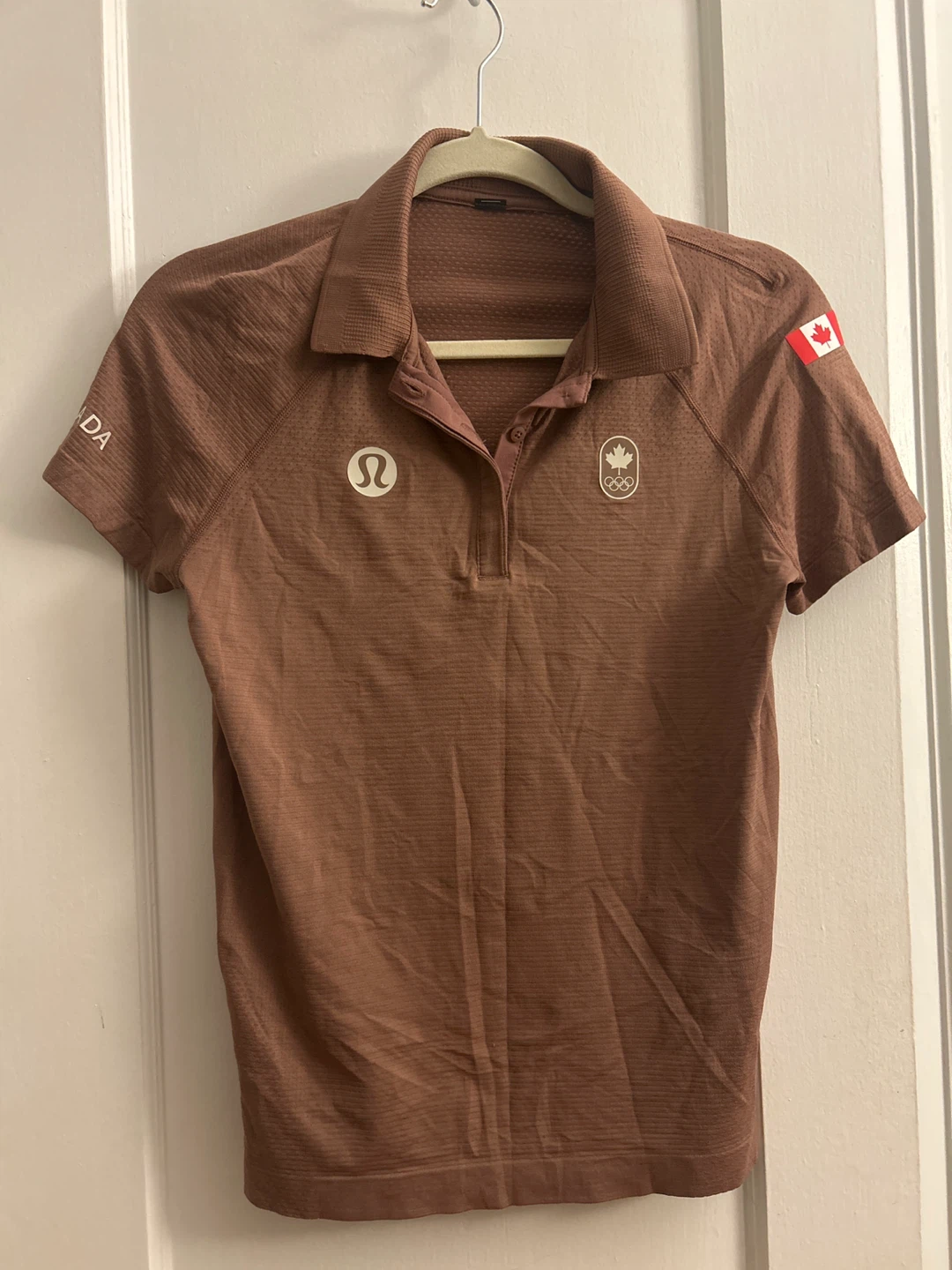 This Lululemon polo shirt proudly displays the Canadian flag and Olympic rings. It features a breathable, textured fabric for comfort. This shirt is great for showing your Canadian pride or for athletic activities.
