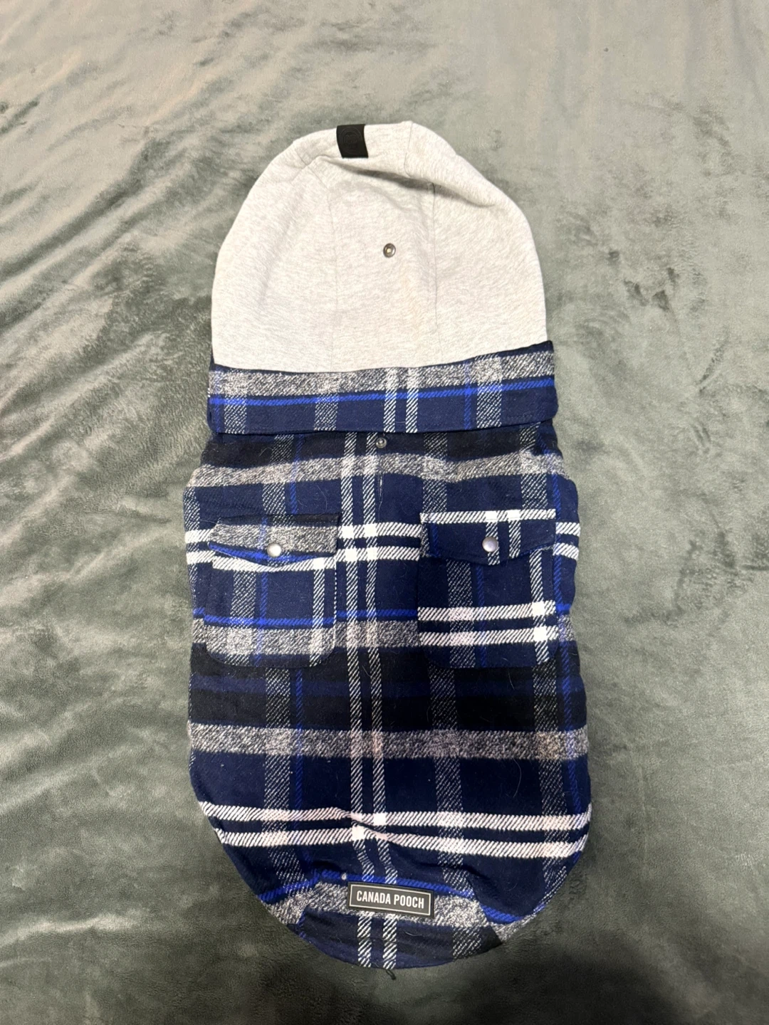 This Canada Pooch dog jacket features a blue and white plaid pattern with a grey hood. It's a size 18, perfect for keeping your furry friend warm. The jacket has two decorative chest pockets.
