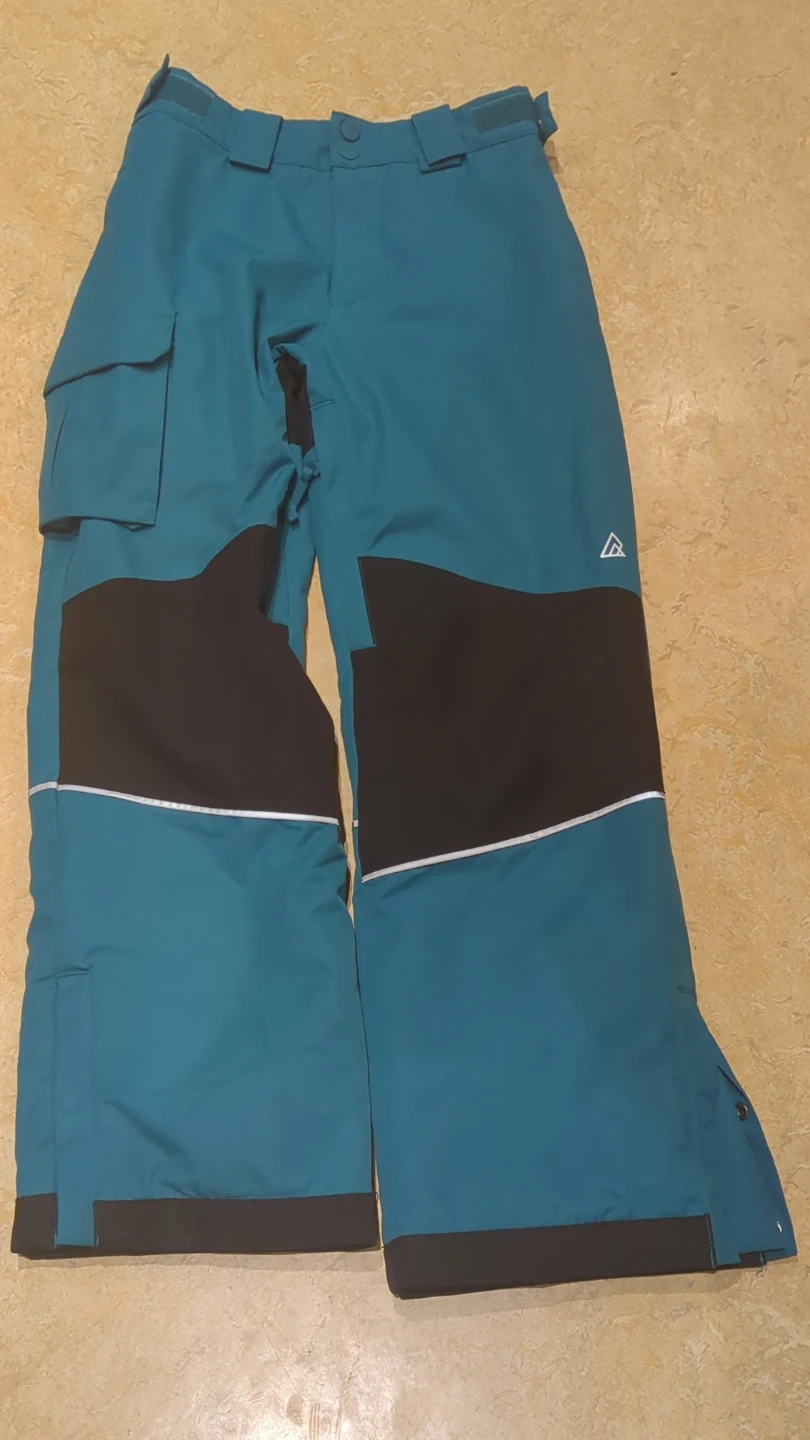 These Ripzone ski pants are teal with black accents. Size medium/medium. They feature multiple pockets and reflective detailing on the legs.