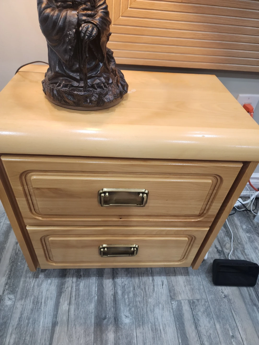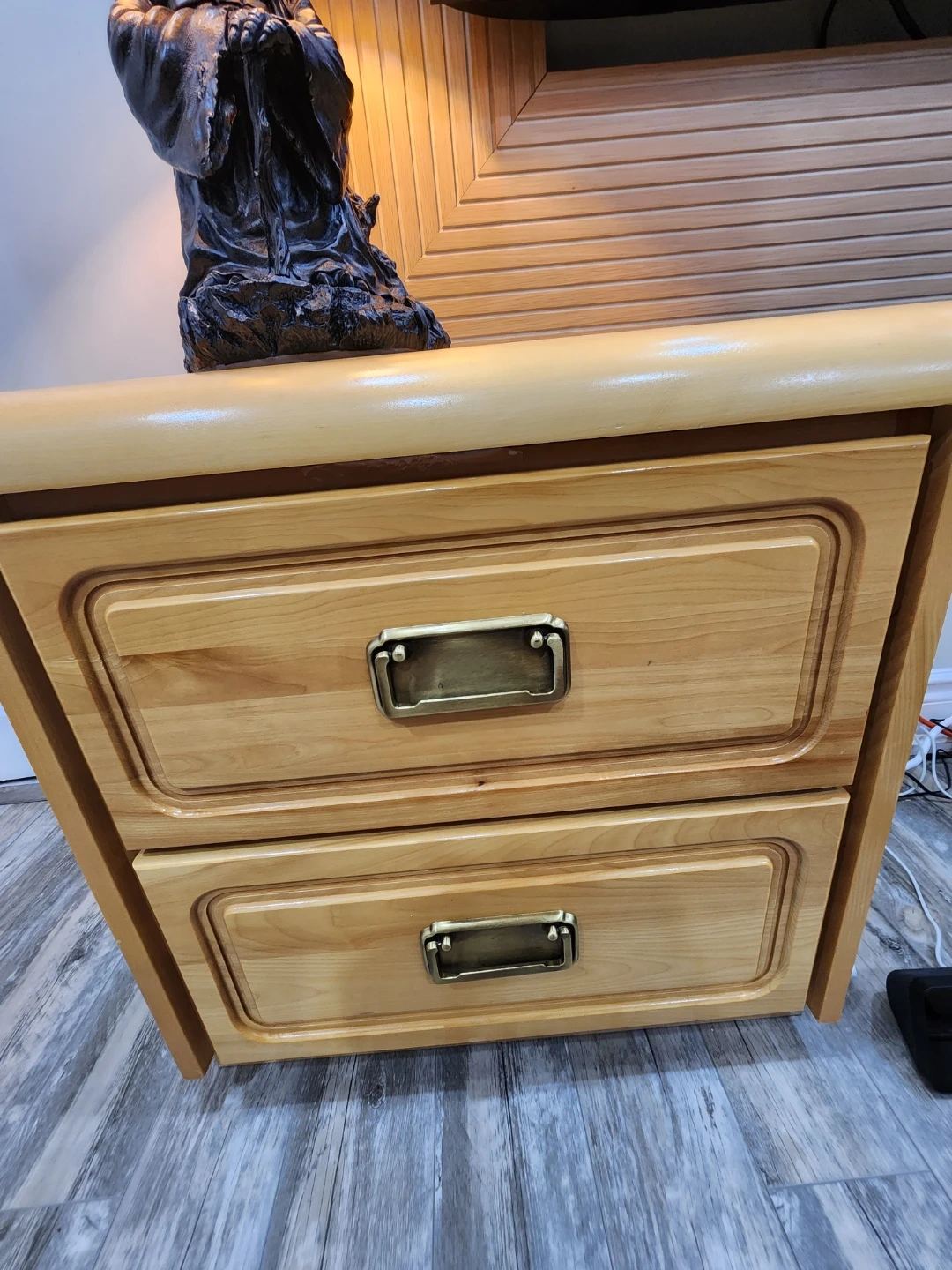 A classic light wood nightstand featuring two drawers with brass-coloured handles. It's perfect for storing bedside essentials. This nightstand would be a nice addition to a bedroom.